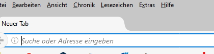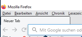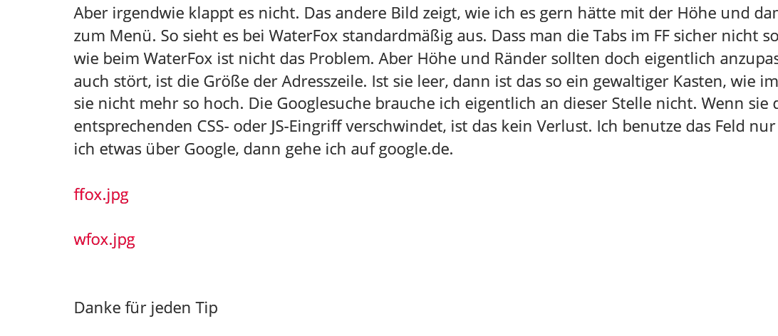 Die beiden Bilder zeigen IST und SOLL. Den Rahmen um die Tabs habe ich zwar wegbekommen, aber dafür ist der aktive Tab jetzt im 3D-Effekt gedrückt. Ich hätte gern die Tabs flach ohne 3D und bei den inaktiven Buttons rechts den Rand. Aber irgendwie klappt es nicht. Das andere Bild zeigt, wie ich es gern hätte mit der Höhe und damit auch dem Abstand zum Menü. So sieht es bei WaterFox standardmäßig aus. Dass man die Tabs im FF sicher nicht so elegant hinbekommt, wie beim WaterFox ist nicht das Problem. Aber Höhe und Ränder sollten doch eigentlich anzupassen gehen. Was mich auch stört, ist die Größe der Adresszeile. Ist sie leer, dann ist das so ein gewaltiger Kasten, wie im Bild. Steht etwas drin, ist sie nicht mehr so hoch. Die Googlesuche brauche ich eigentlich an dieser Stelle nicht. Wenn sie durch einen entsprechenden CSS- oder JS-Eingriff verschwindet, ist das kein Verlust. Ich benutze das Feld nur für Web-Adressen. Suche ich etwas über Google, dann gehe ich auf google.de.