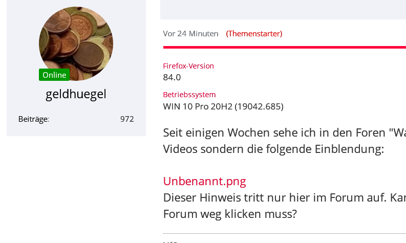 Seit einigen Wochen sehe ich in den Foren "Was hört Ihr gerade" und "Was schaut ihr gerade" nicht die "Startbilder" der Videos sondern die folgende Einblendung: