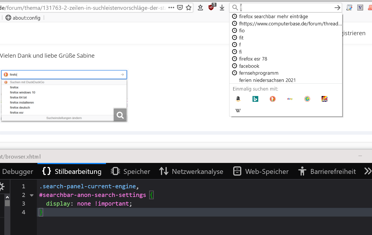 wäre es mit einem Script oder CSS Code möglich, die beiden grauen Zeilen "Suchen mit DuckDuckGo" und "Sucheinstellungen ändern" unter der Suchleiste der Startseite (Standard) auszublenden, um ein paar mehr Suchvorschläge zu bekommen ?