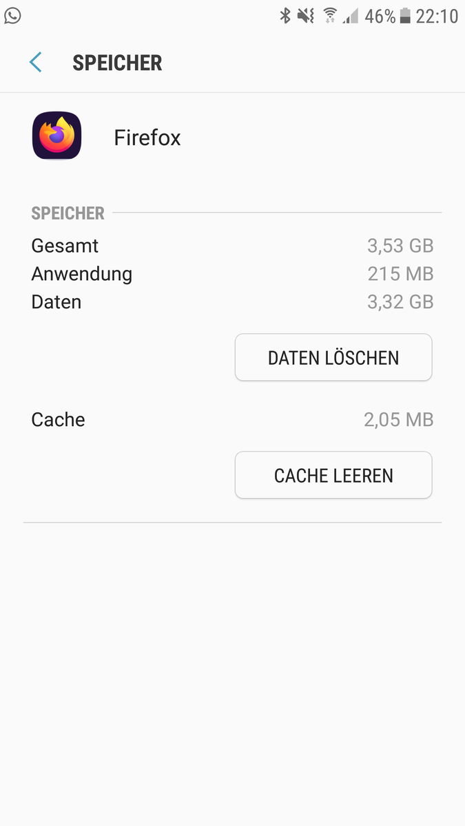 Ich habe sein Samsung Galaxy S6 mit Firefox drauf. Da ich zu wenig Speicherplatz zur Zeit habe, habe ich alle Apps durchforstet um zu sehen, welches App viel braucht.