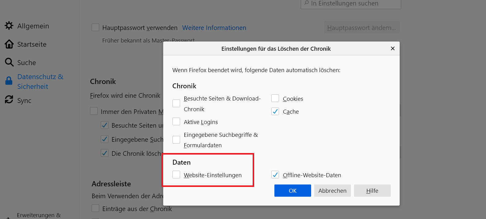 "Cookies und Website-Daten beim Beenden von Firefox löschen" ist nicht aktiviert.