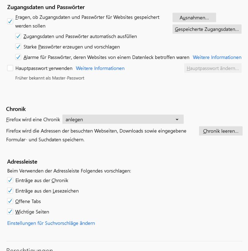 • Die von 2002Andreas genannte Einstellung findest du unter Datenschutz & Sicherheit, Chronik, "Firefox wird eine Chronik "benutzerdefiniert" anlegen.