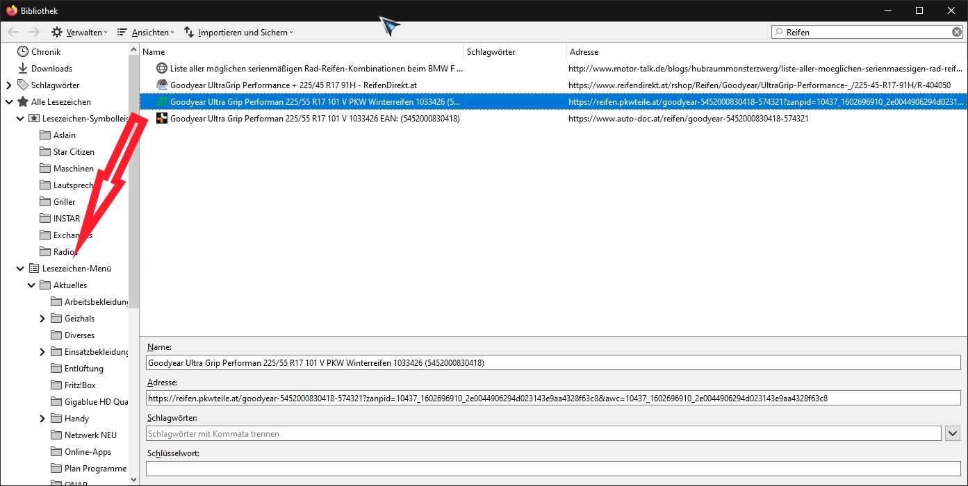 Wenn ich nun in der Bibliothe danach suche finde ich zwar den gesuchten Link (Lesezeichen), sehe aber nicht in welchem Ordner sich dieser befindet. Sprich, wenn ich nicht genau weiss wie das Lesezeichen (der Link) heisst, ich aber weiss dass sich ein anderes im selben Ordner befindet, finde ich zwar das andere aber der Ordner in dem es sich befindet scheint nirgens auf. Und deshalb finde ich dann auch das gesuchte, welches im selben Ordner liegt nicht.