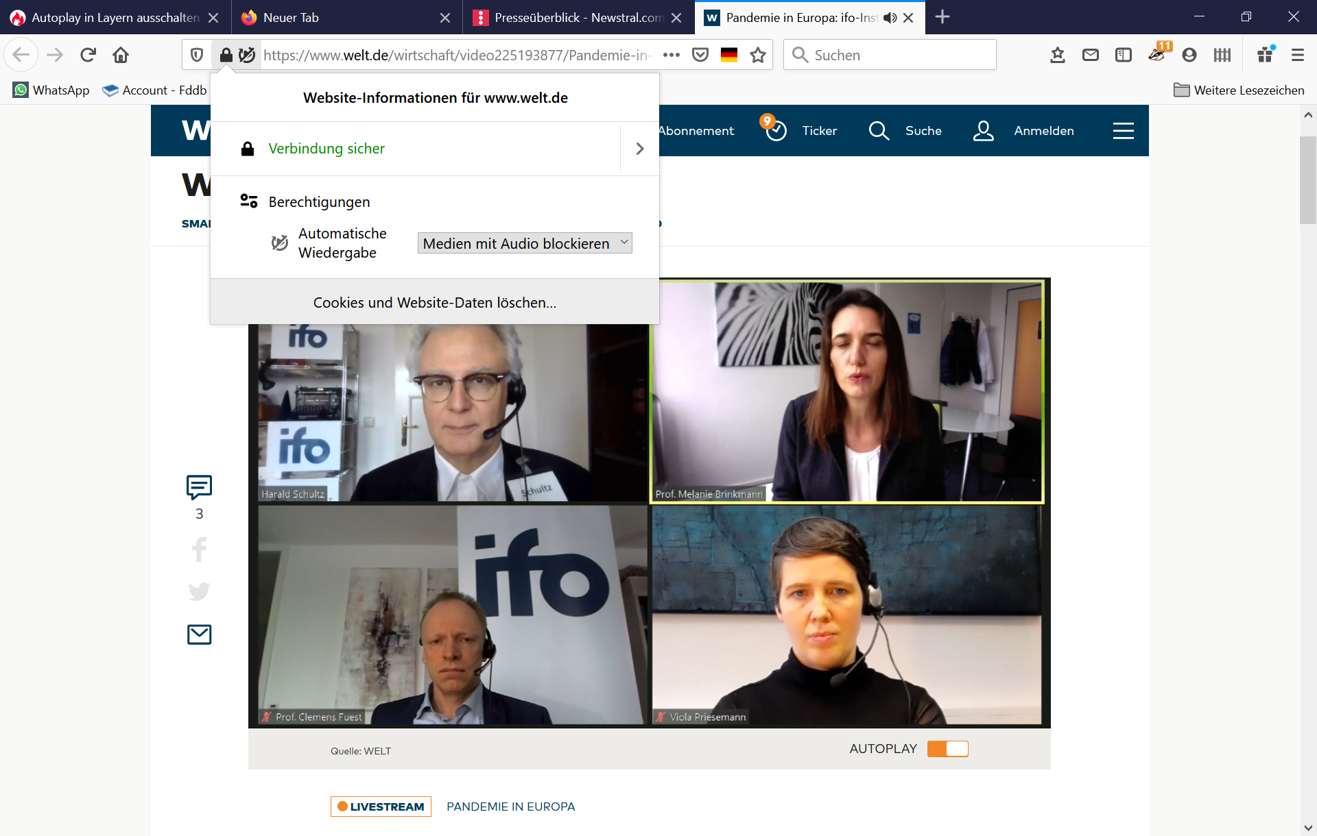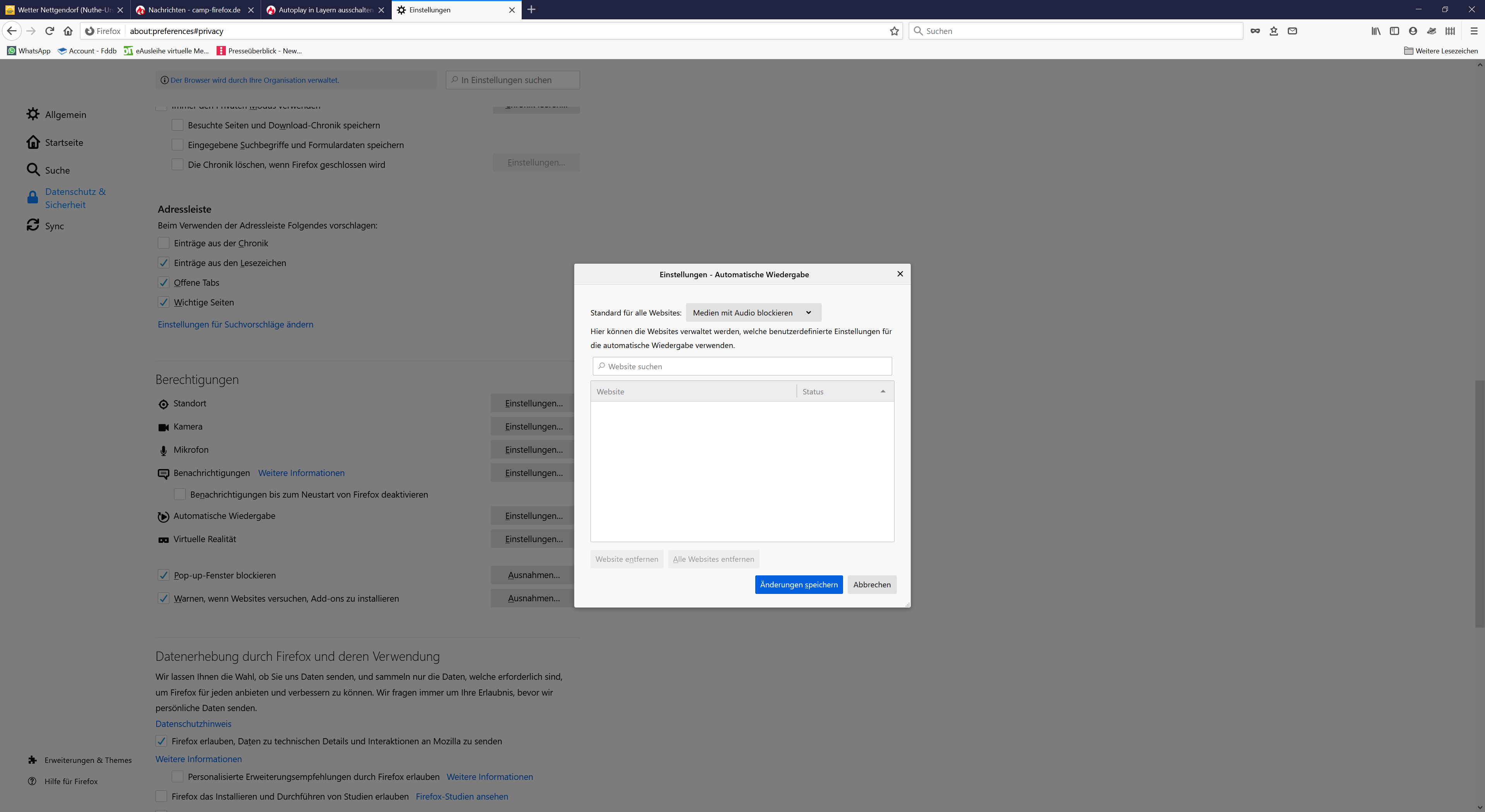 Seit einiger Zeit gelingt es mir nicht mehr, Autoplay über about:config auszuschalten. Bei Seiten wie beispielsweise n-tv.de, welt.de, wetter.com usw. öffnen sich die Videos in Layern und ich finde keine Möglichkeit mehr, das automatische Abspielen zu unterbinden.