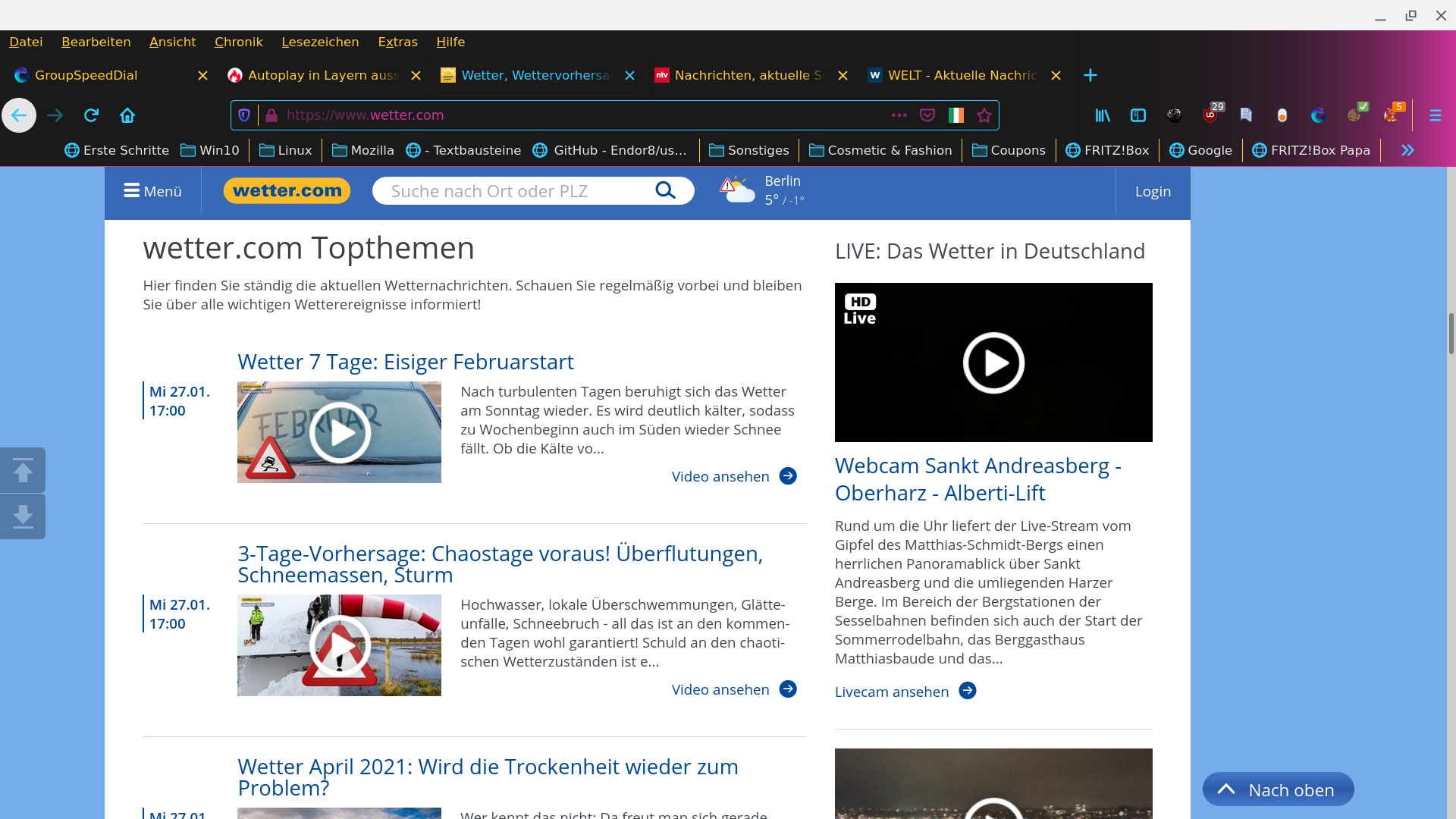 • Also bei mir spielt kein einziges Video sich ungefragt ab. Habe es eben mal auf http://www.welt.de, http://www.n-tv.de sowie auf http://www.wetter.com ausprobiert. Firefox ist auf den Standardeinstellungen eingestellt und hat zudem uBlock Orgin. Aber selbst ohne aktiviertes uBlock Orgin spielt da nix ungefragt ab.
