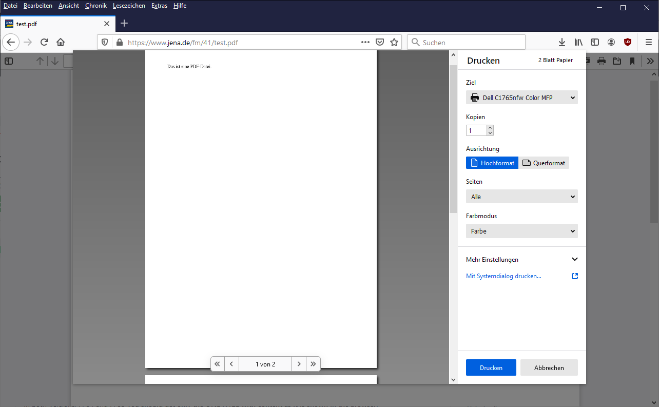 • ab Firefox 85 wird zusätzlich eine zweite leere Seite ausgedruckt bei dem Beispiel-pdf