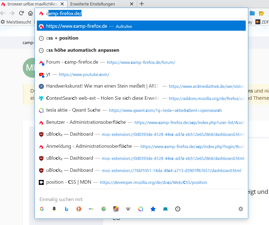 Mit Änderung des Wertes browser.urlbar.maxRichResults in about:config auf 14 sieht das hier so aus: