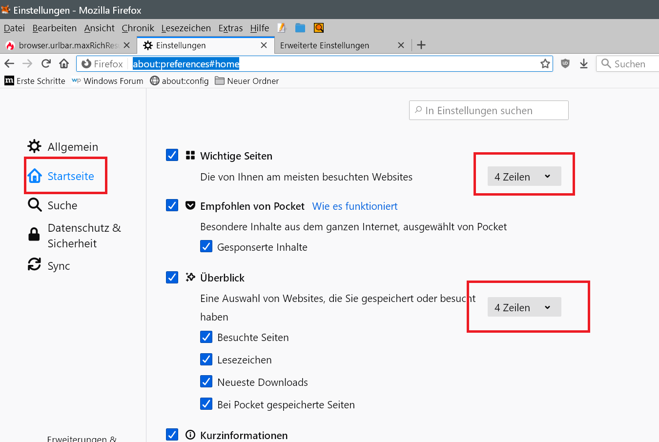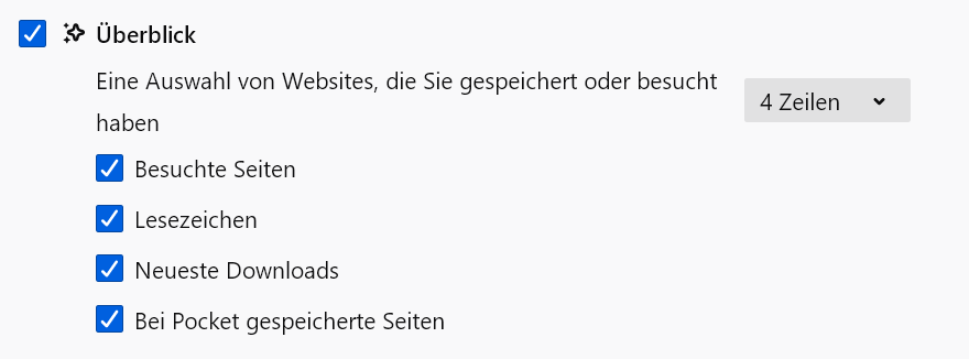 Falls du die Liste der vorgeschlagenen Seiten direkt nach Klick in die Adressleiste meinst, ohne dass du auch nur einen Buchstaben eingegeben hast, musst du in den Startseiten-Einstellungen die Anzahl der Zeilen anpassen. Denn diese Vorschläge kommen von der Firefox-Startseite und die Anzahl, die du in der Adressleiste sehen möchtest, muss von der Startseite abgedeckt werden. Bei acht Seiten pro Zeile bedeutet dies zwei Zeilen auf der Startseite, wenn du zwischen acht und sechszehn Seiten in der Adressleiste sehen möchtest.