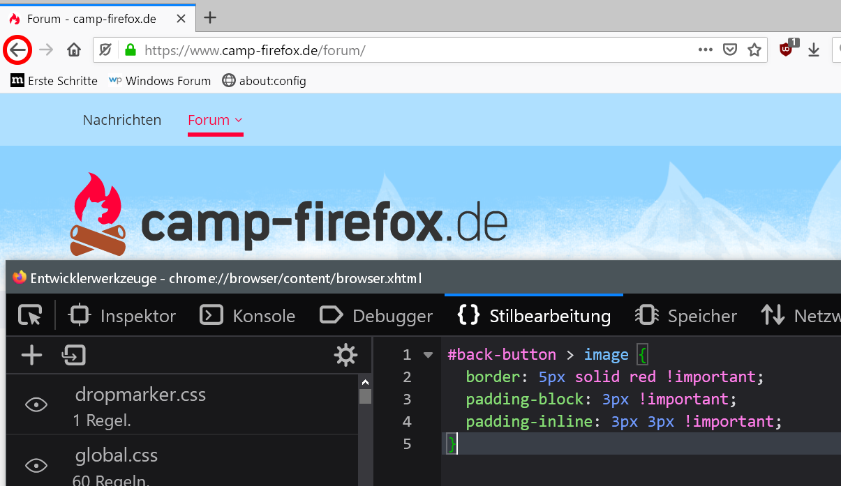 CSS/* Rahmen um Adress- und Suchleiste */ #urlbar, #searchbar { border: 2px solid darkgreen !important; border-radius: 10px !important; } #back-button { border: 2px solid darkgreen !important; }EDIT: Und könntest du mir mit dem Inspector evt. zeigen, wie man zu dem Image gelangt? Das wäre toll, danke.