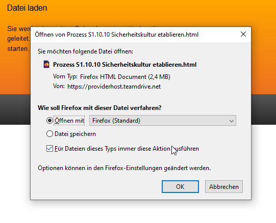 Ich finde leider keine Einstellung um folgendes zu lösen. Wenn ich in einem html Dokument das im firefox geöffnet ist einen link anklicke um ein weiteres html Dokument zu öffnen, verlangt er jedesmal eine Bestätigung wie ich mit dem Dokument umgehen möchte (siehe Screenshot). Das will ich aber nicht, sondern er soll das Dokument gleich öffnen. Bei pdf Dateien als link klappt das Problemlos. Auch wenn ich angebe das er bei diesem Dateityp immer so verfahren soll, kommt das Abfragefenster jedesmal.