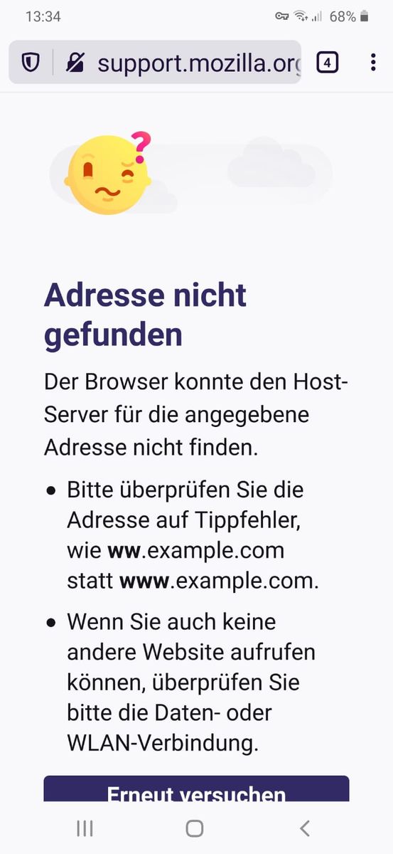 Hallo, ich kann viele Webseiten, darunter auch die von Mozilla zwar mit dem Laptop, aber nicht mehr mit dem Android 10, Samsung A40 aufrufen.