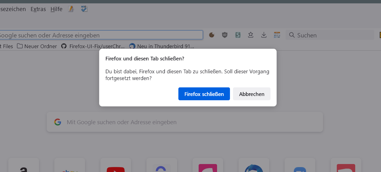 Ich habe die entsprechenden Zeilen aus dem obigen Script ins Neue eingesetzt. Wenn ein oder mehrere Tabs beim schließen geöffnet sind kommt die Abfrage ob ich wirklich will. Ist der eine Tab aber home oder newtab kann ich FF gar nicht mehr schließen. Leider habe ich ja keine Ahnung vom Programmieren und nur mit vergleichen und probieren gearbeitet.