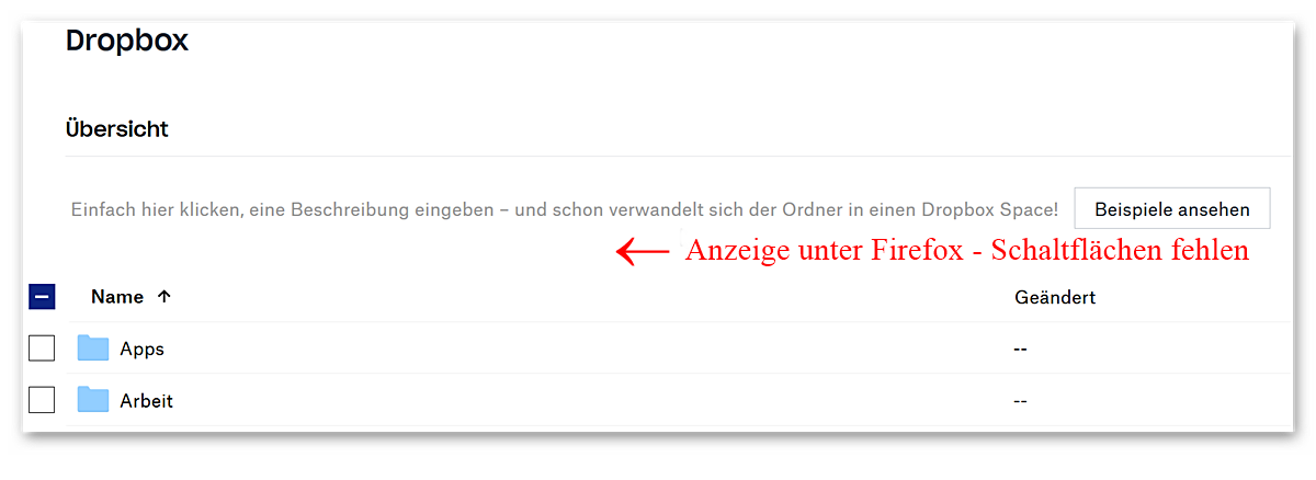 Zum Beispiel unter Dropbox, hier fehlen mir die Schaltflächen zum herunterladen usw. ich hab zur Veranschaulichung mal 2 Grafiken hier mit angehängt, eine wie es unter Firefox aussieht, und eine wie es unter MS Edge aussieht.