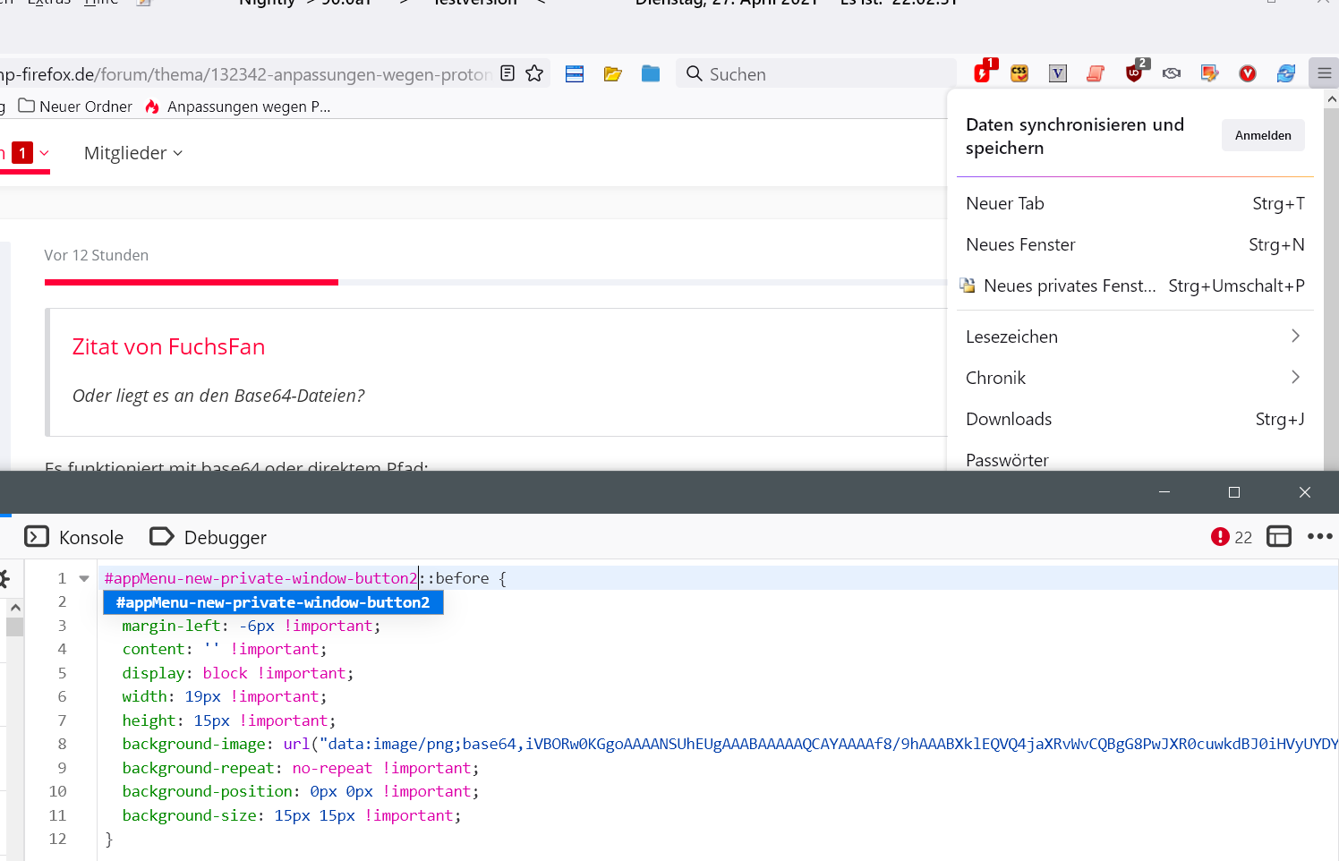 Nun habe ich mal diesen Code in die Datei von Endor eingefügt, dann ist das Icon da. Darauf aufbauend wollte ich andere (privates Fenster, usw,) anzeigen, aber es passiert nichts. Haben sich da eventuell doch die Selektoren geändert?