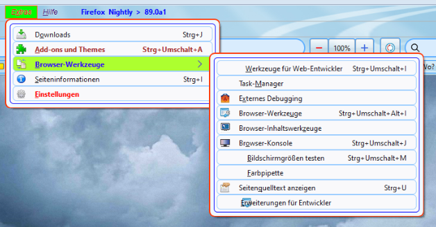 Wenn du dann jetzt für Nightly (Proton) mir noch diese Selektoren (Felder ohne Icons) für das Menü Extras nennen könntest, dann würde wieder Freude aufkommen. In der 88beta ist alles noch da.