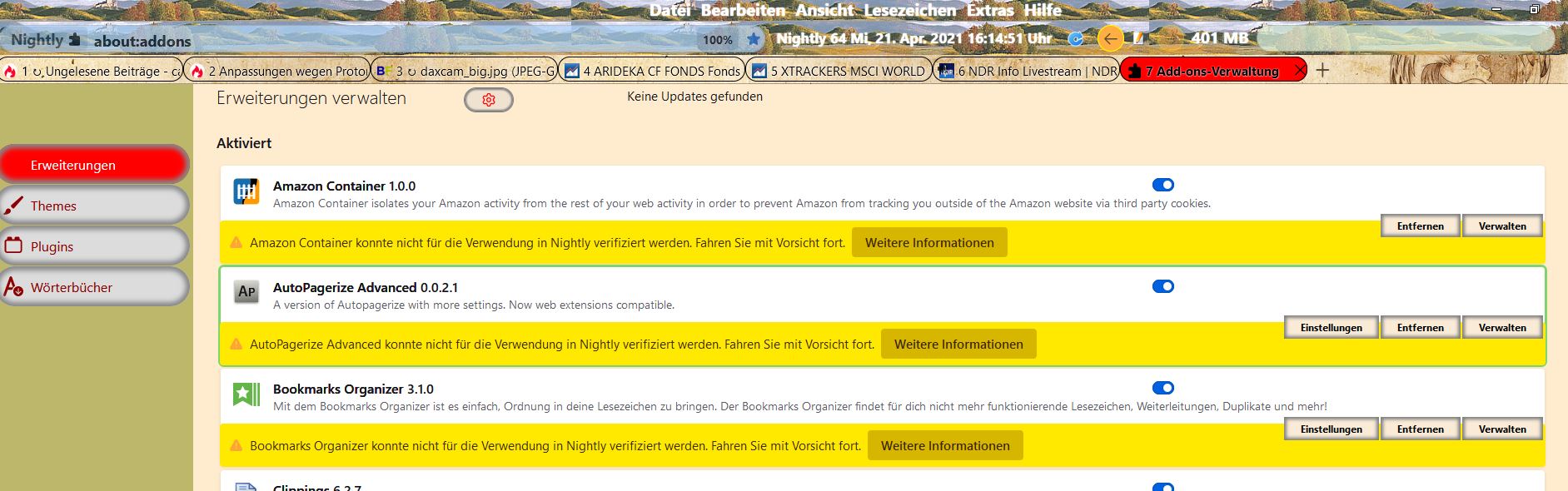 Du hast das immer noch nicht verstanden. Der Schalter xpinstall.signatures.dev-root ist speziell für die Bergamot-Erweiterung, muss also auf true gesetzt werden. Das Problem ist der Schalter xpinstall.signatures.enabled, der - wie Sören erklärt hat - in diesem Fall auf false gesetzt werden muss. Und erst das ruft die gelben Textbalken im Add-on-Manager hervor, weil das die Signierung von Erweiterungen deaktiviert, denn standardmäßig steht xpinstall.signatures.enabled auf true, das heißt Signierung ist erforderlich.