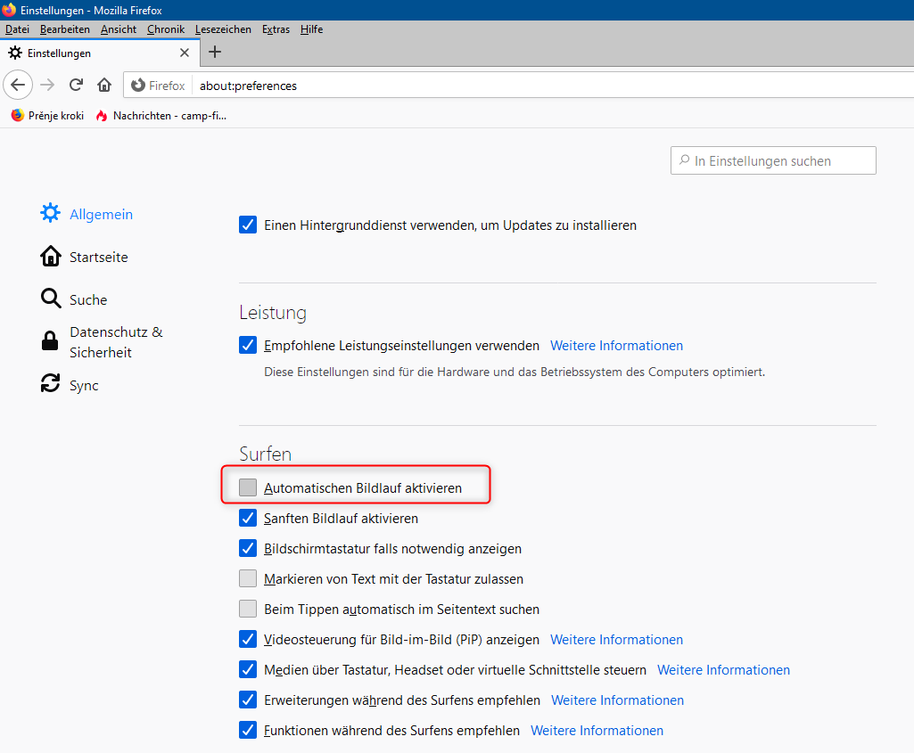 • Das Skript funktioniert hier im Nightly (wie Boersenfeger schon schrieb, ist das Fx 89.0). Wenn du die Vorbereitungen richtig getroffen hast, wie sie hinter dem Link von 2002Andreas in Beitrag #2 zu finden sind, ist wahrscheinlich der Hinweis in der letzten Skriptzeile nicht erfüllt, das heißt, du hast den automatischen Bildlauf in den Firefox-Einstellungen aktiviert. Den musst du deaktivieren: