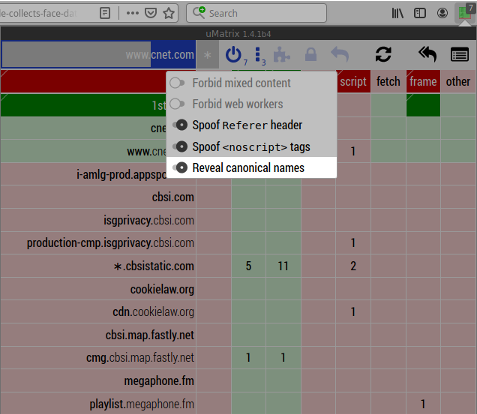 By default, the rule cname-reveal: * true is created in new installations of uMatrix. For existing installations, you will have to add it yourself if you want canonical names to be reported in the matrix everywhere by default. This new feature is supported only in Firefox.