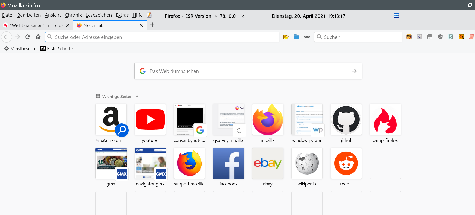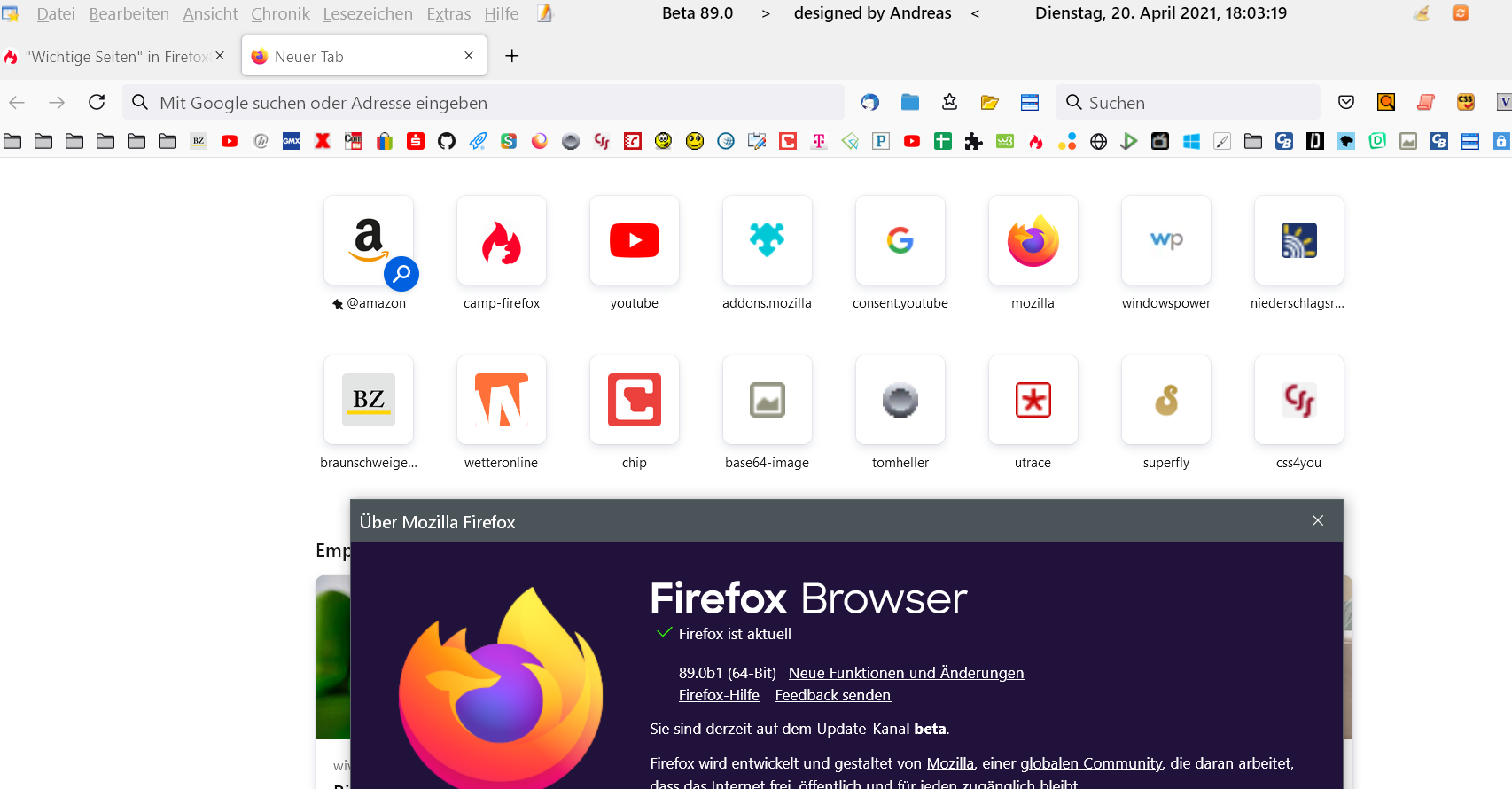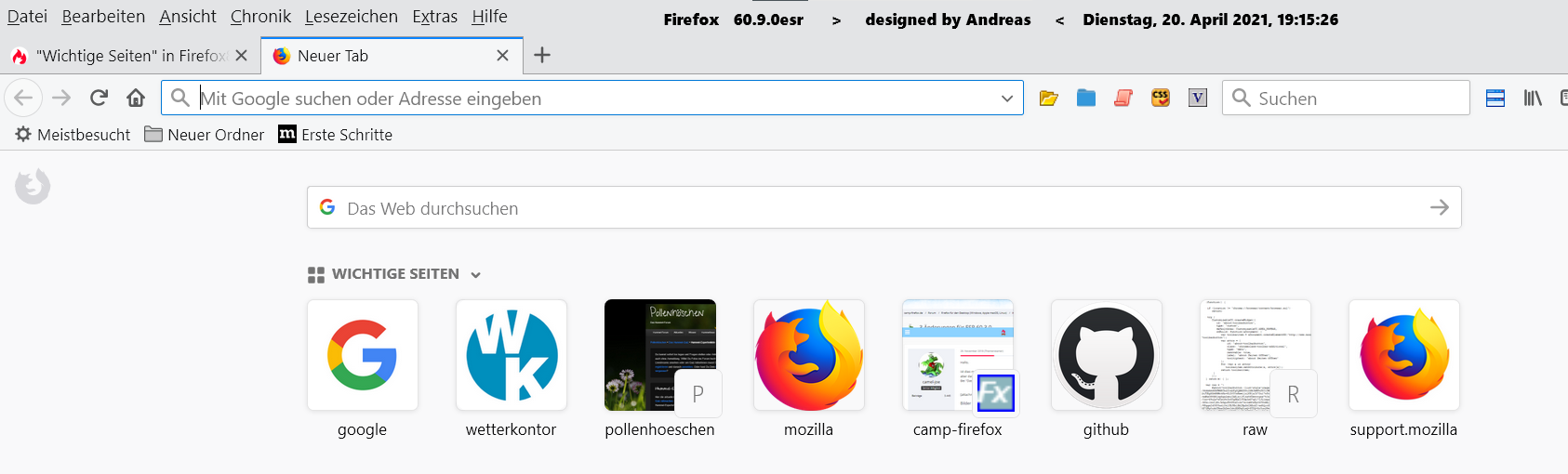 Ich habe gerade Firefox Developer mit der Version 89 gestartet um dort eine Änderung vorzunehmen und stelle fest, dass die Vorschaubilder der jeweiligen Webseiten nicht mehr Bilder der Webseiten sind sondern nur noch vorgefertigte Buchstaben habe (Anfangsbuchstaben).