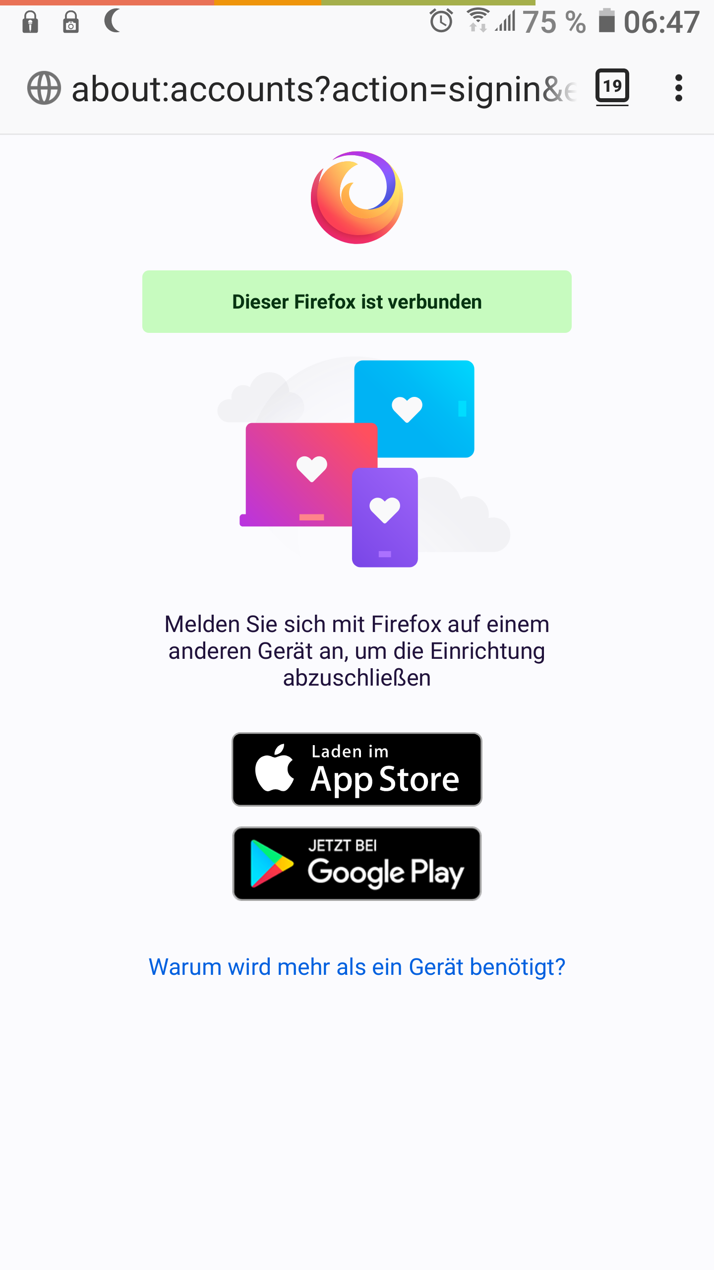 Im Konto auf dem Desktop wird der Android-Firefox jedesmal neu angezeigt, wenn ich ihn zuvor dort löschte und neu anmeldete. Auch „... ist verbunden“ wird im Android angezeigt, und dann ist Schluss. Für "normale" Anwender ist sowas frustrierend.