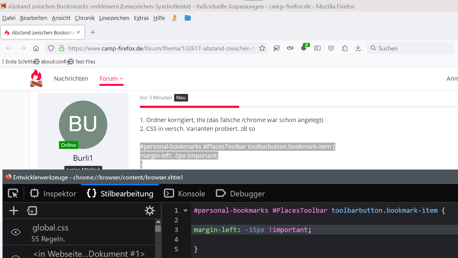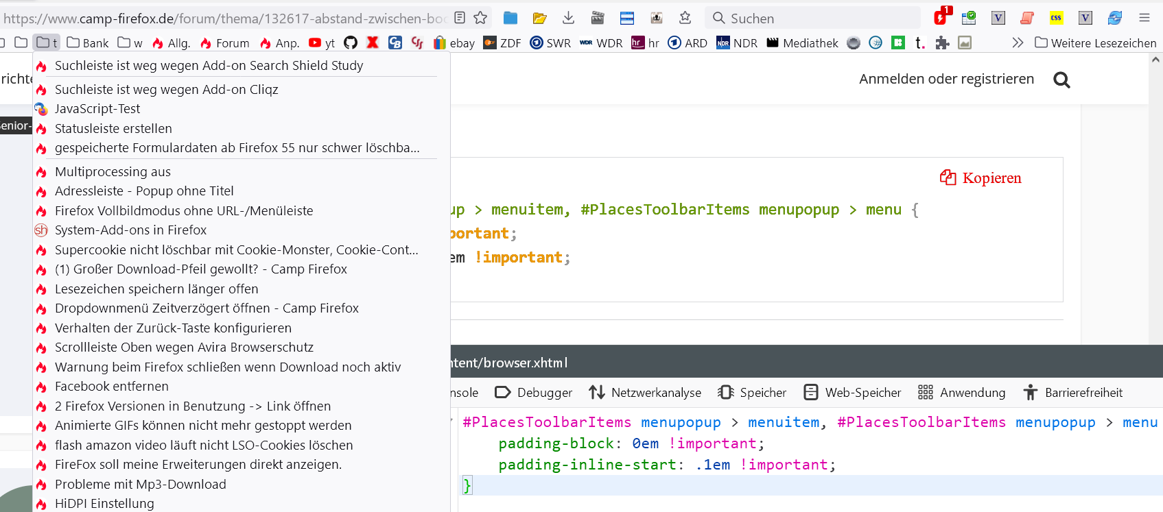 Ich möchte aber gerne wieder meine Lesezeichen etwas enger in der Leiste haben um dort mehr zu plazieren. Früher habe ich einen Code ähnlich dem aus diesem Beitrag verwendet: Abstand zwischen Booksmarks verändern (Lesezeichen-Symbolleiste)