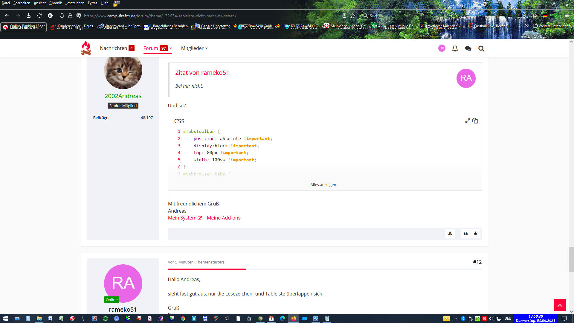 Ich sehe die Tableiste nicht mehr. Vorher war meine Darstellung von oben nach unten: Menüleiste, Adressleiste, Lesezeichenleiste, Tableiste.