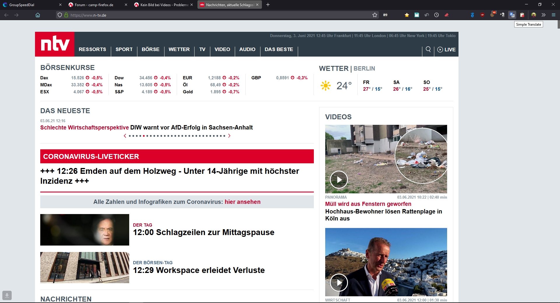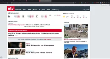 ich habe heute morgen Firefox gestartet und n-tv.de aufgerufen. Die Seitendarstellung war anders als gestern (blaue Schrift in Titeln) und umfasste nicht mehr den ganzen Bildschirm trotz Einstellung 120%. Dazu kommt, dass beim Abspielen von Videos kein Bild, sondern nur Ton erscheint Ich habe Cookies und Chronik gelöscht, ändert aber nichts. Der VLC Video Player plus wurde allerdings gleich nach dem PC-Start aktualisiert. Edge und Opera zeigen Videos ganz normal an.