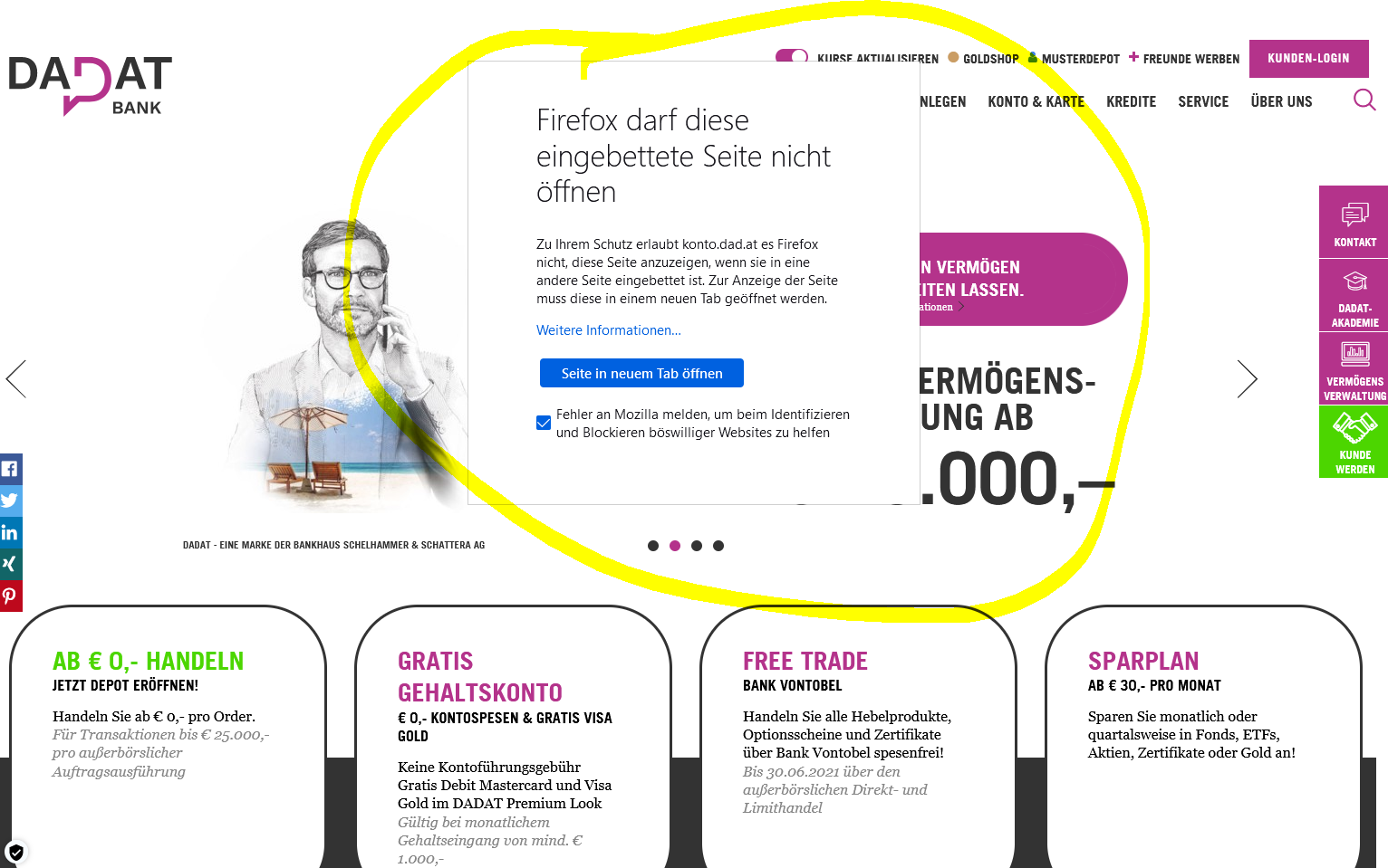 Diese Homepage, die ich seit einem Jahr immer über Lesezeichen aufrufe - geht zwar auf aber, wenn ich auf dann auf Anmelden gehe kommt die Info dass die Seite nicht aufgeht weil Firefox diese eingebettete Seite nicht öffnen darf.
