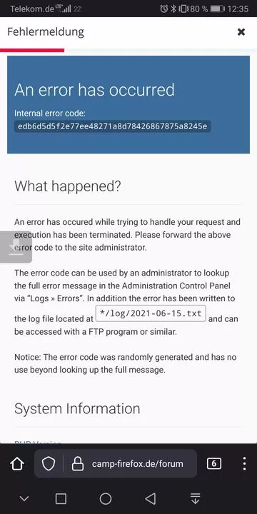 Laut weiterer Beschreibung auf der Seite soll der Fehlercode an den Seitenbetreiber weitergeleitet werden, was ich hiermit tue. ![]()