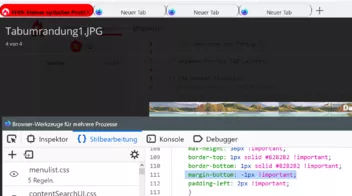 CSS Alles anzeigen/* Tabs rund und farbig */ /* Angaben für die TAB-Leiste*/ /* TAB normal (inaktiv): * Hintergrundfarbe, Schriftfarbe, * Rahmen um die TABs, oben abgerundet und Abstände angepaßt, * unten kein Rahmen -> Abschlußrahmen vom Container.*/ #TabsToolbar .tabbrowser-tab { color: black !important; border: 1px solid !important; border-bottom: 1px solid black !important; border-radius: 16px 16px !important; margin-top: 0px !important; padding: 0px !important; } /* TAB bei bei angewähltem TAB (aktiv): * Hintergrundfarbe, Rahmen, * Schriftfarbe. */ #TabsToolbar .tabbrowser-tab[selected="true"] { background: red !important; border-radius: 16px 16px !important; margin-top: 0px !important; padding: 0px !important; font-weight: bold !important; color: black ! important; } /* Tab-Icon etwas größer, * links weniger, unten etwas mehr Abstand zum TAB-Rand.*/ #TabsToolbar .tab-icon-image { height: 20px !important; width: 20px !important; margin-left: -5px !important; margin-bottom: 2px !important; } /* Tab-Schließen-Button: * Rechts weniger Abstand zum TAB-Rand, etwas größer, * Textfarbe (Kreuz) * Hintergrundfarbe, an den Eckenradius des Buttons angepaßt */ #TabsToolbar .tab-close-button { margin-right: -5px !important; color: black !important; } #TabsToolbar .tab-close-button .toolbarbutton-icon { height: 20px !important; width: 20px !important; background-color: red !important; border-radius: 14px !important; } /* Schliessen-Button nur wenn angewählt */ tab:not([selected]) .tab-close-button {display: none !important; } /* Alle anderen Elemente in den TABs ohne Hintergrund. */ #TabsToolbar .tabbrowser-tab * { background: none !important; } /* Schriftgröße Tabs */ .tab-text { font-size:15px !important; } /* Damit wird der Tabtext am Ende nicht ausgeblendet */ .tab-label-container[textoverflow][labeldirection=ltr]:not([pinned]), .tab-label-container[textoverflow]:not([labeldirection]):not([pinned]):-moz-locale-dir(ltr) { direction: ltr; mask-image: linear-gradient(to left, transparent, black 0em) !important; } /* Doppelte Schliessung ausblenden */ #TabsToolbar > .titlebar-buttonbox-container { display:none !important; } /* Tabs Proton-Design */ :root { --proton-tab-radius: 0px !important; --proton-tab-block-margin: 0px !important; --inline-tab-padding: 10px !important; } #TabsToolbar { min-height: 36px !important; max-height: 36px !important; border-top: 1px solid #B2B2B2 !important; border-bottom: 1px solid #B2B2B2 !important; margin-bottom: 1px !important; padding-left: 2px !important; } #TabsToolbar .toolbarbutton-1 { margin-top: 2px !important; margin-bottom: 2px !important; } #TabsToolbar .toolbarbutton-1 > image { padding: 2px 4px !important; } /* Rahmen um die Tableiste durchsichtig */ #TabsToolbar { border: 0.2px solid transparent !important; } #TabsToolbar:hover { border: 0.2px solid transparent !important; } .tabbrowser-tab[label*=" - YouTube"] .tab-content, .tabbrowser-tab[label*="YouTube - youtube.com"] .tab-content { background-image: linear-gradient(to bottom, red 0%, red 14%, red 14%, red 100%) !important; } .tabbrowser-tab[label*=" - YouTube"][selected="true"] .tab-content, .tabbrowser-tab[label*="YouTube - youtube.com"][selected="true"] .tab-content { background-image: linear-gradient(to bottom, green 0%, green 14%, red 14%, red 100%) !important; } .tabbrowser-tab[label*=" - YouTube"]:hover .tab-content, .tabbrowser-tab[label*="YouTube - youtube.com"]:hover .tab-content { background-image: linear-gradient(to bottom, saddlebrown 0%, saddlebrown 14%, saddlebrown 14%, saddlebrown 100%) !important; } .tabbrowser-tab[label*=" - YouTube"][selected="true"]:hover .tab-content, .tabbrowser-tab[label*="YouTube - youtube.com"][selected="true"]:hover .tab-content { background-image: linear-gradient(to bottom, green 0%, green 14%, saddlebrown 14%, saddlebrown 100%) !important; } .tabbrowser-tab .tab-content vbox.tab-label-container.proton { -moz-box-orient: horizontal !important; } .tabbrowser-tab .tab-content vbox.tab-label-container.proton hbox.tab-icon-sound { margin-top: 0px !important; margin-right: 0px !important; } .tab-icon-sound[soundplaying="true"], .tab-icon-sound[muted="true"], .tab-icon-sound[activemedia-blocked="true"] { background: #FFF !important; padding: 0 1px !important; } .tab-icon-sound[soundplaying="true"] .tab-icon-sound-image, .tab-icon-sound[muted="true"] .tab-icon-sound-image, .tab-icon-sound[activemedia-blocked="true"] .tab-icon-sound-image { fill: #F10 !important; } .tab-icon-sound-image { height: 1.7em !important; } .tabbrowser-tab .tab-content vbox.tab-label-container.proton label[class="tab-icon-sound-label tab-icon-sound-blocked-label"], .tabbrowser-tab .tab-content vbox.tab-label-container.proton label[class="tab-icon-sound-label tab-icon-sound-playing-label"], .tabbrowser-tab .tab-content vbox.tab-label-container.proton label[class="tab-icon-sound-label tab-icon-sound-muted-label"] { display: none !important; } /* Tab Beschriftung mittig */ .tab-content { display: flex !important; justify-content: center !important; align-items: center !important; } .tab-label-container { margin: auto !important;} .tabbrowser-tab > .tab-stack > .tab-content > .tab-close-button { flex-shrink: 0 !important; padding: 0px !important; padding-top: -5px!important; width: 16px !important; } /*Tabs in Tableiste mittig*/ scrollbox:not(#PlacesToolbarItems) { -moz-box-pack: center !important; } /* Lautsprechersymbol größer */ .tab-icon-overlay { transform: scale(1.7, 1.7) !important; } image.tab-icon-overlay { top: 3px !important; padding-right: 3px !important; } /* Aktiver Tab breiter */ .tabbrowser-tab:not([pinned]):not([selected]) { min-width: 200px !important; max-width: 200px !important; } .tabbrowser-tab:not([pinned])[selected] { min-width: 256px !important; max-width: 256px !important; } /* Schatten drum */ #TabsToolbar:not([brighttext]) #tabbrowser-tabs:not([noshadowfortests]) .tabbrowser-tab:is([visuallyselected="true"], [multiselected]) > .tab-stack > .tab-