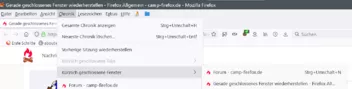 Vierter Versuch (was da aktiv war, ist mir entgangen): hat ein Fenster mit nur einem Tab geöffnet, dessen Inhalt nichts mit den im geschlossenen Fenster enthaltenen zu tun hat und von mir irgendwann vor einer Woche aufgerufen worden war, also lange vor dem, was ich suche.