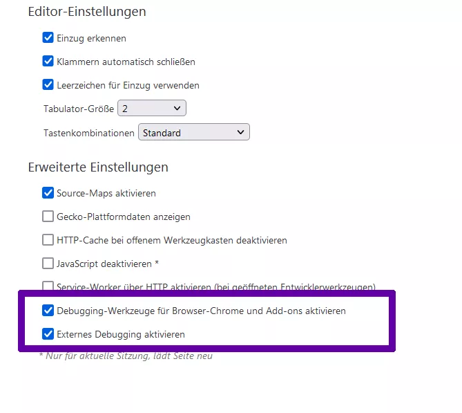 21. Juni 2021 um 00:10 #2 user_pref("devtools.chrome.enabled", true);user_pref("devtools.debugger.remote-enabled", true);Und um sich beim Öffnen der Browser-Werkzeuge die Abfrage zu ersparen:user_pref("devtools.debugger.prompt-connection", false);