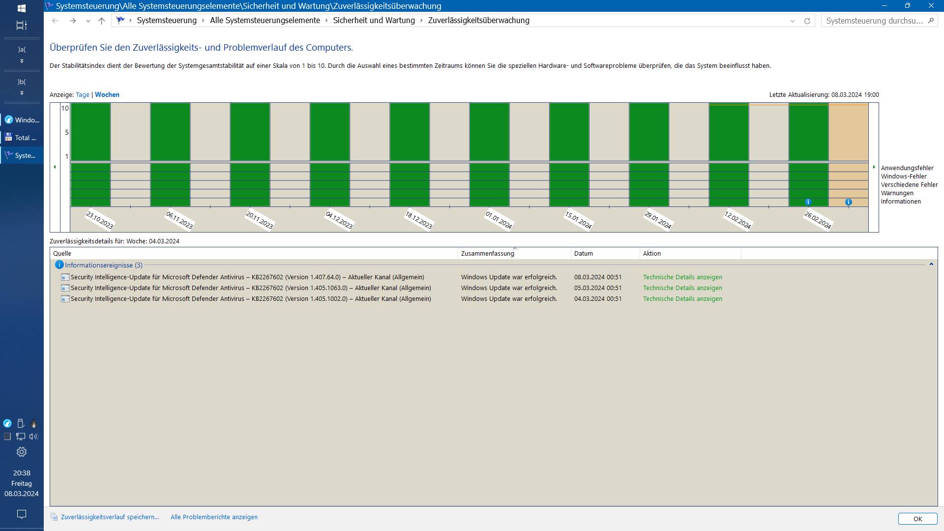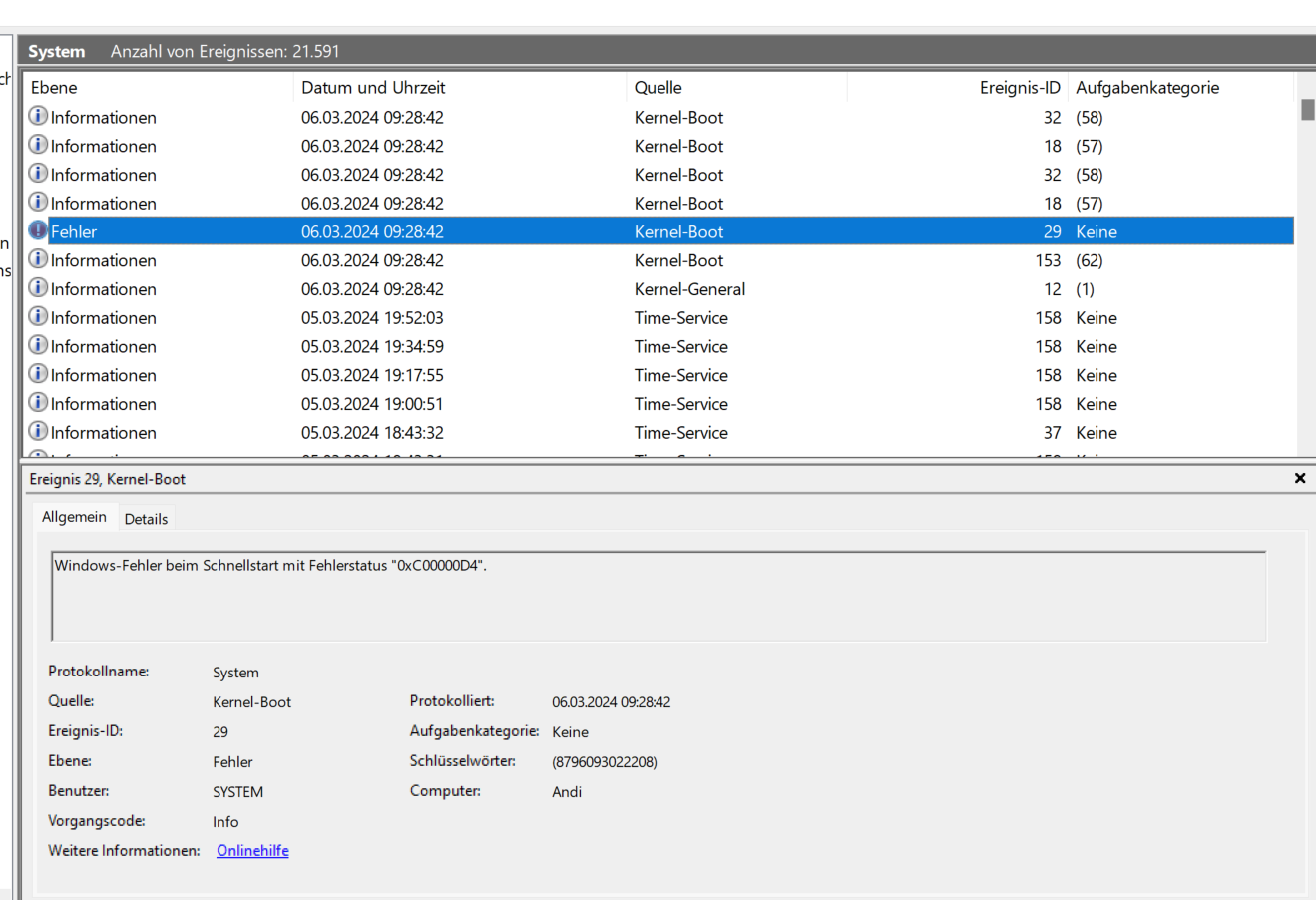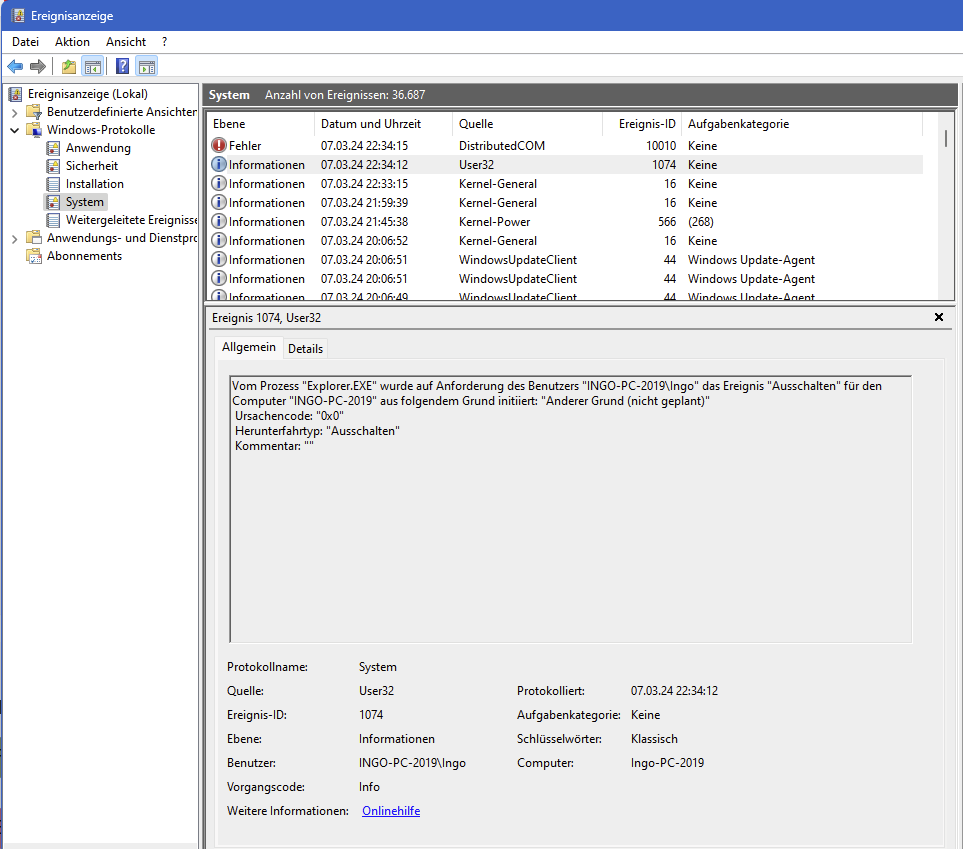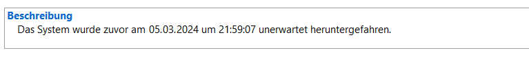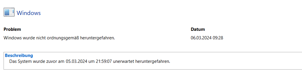 das meinte ich nicht. Das ist ziemlich nichtssagend. Ich halte vom Zuverlässigkeitsverlauf eh nicht so viel. Schau bitte mal direkt in die Ereignisanzeige. Dort sollte das Ereignis protokolliert sein. Das sieht dann in etwa so aus: