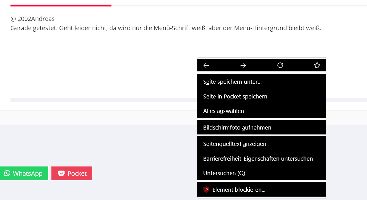 Bei der Einrichtung eines MX-Linux 19.4 KDE mit dem FF-89.0.2 habe ich MX auf das Breeze-Dunkel-Theme gestellt und Firefox läuft auch im Dark-Theme. Leider scheint das die Menüs und die Kontext-Menüs nicht zu interessieren, denn die sind immer noch schwarz auf weiß.