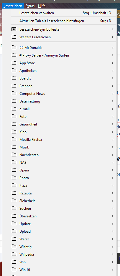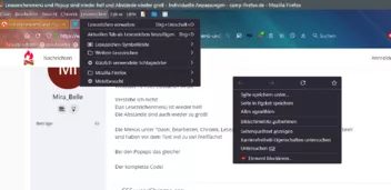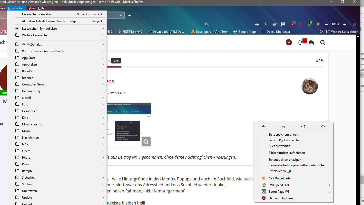 Lesezeichenmenü und Popup sind wieder hell und Abstände wieder groß