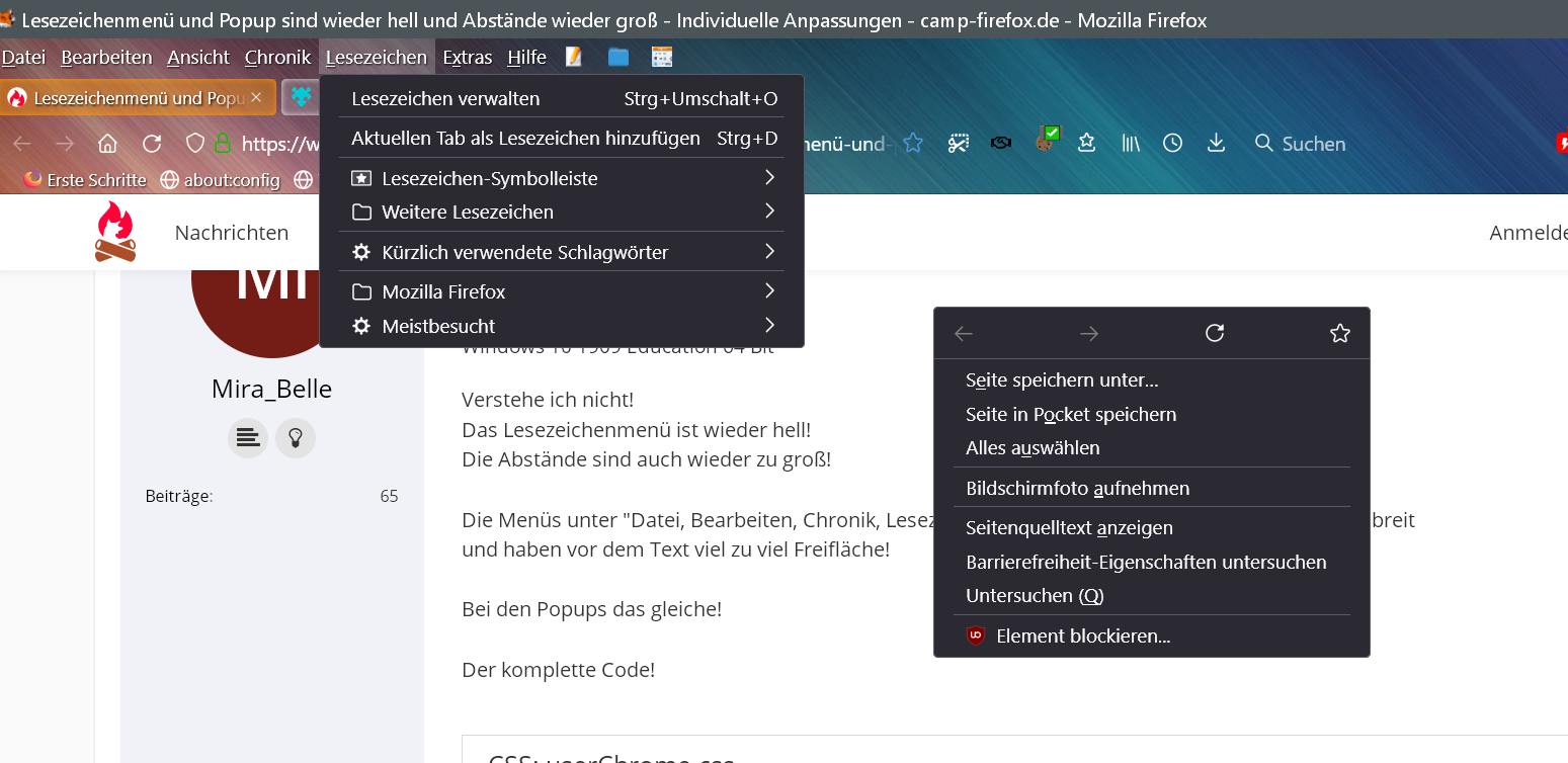• Du hast dich dafür entschieden, CSS für Firefox (userChrome) zu nutzen. Entweder konsequent mit Änderungen leben oder sein lassen. Und falls, sich am besten auf das beschränken, was man auch allein hinbekommt - und CSS büffeln.