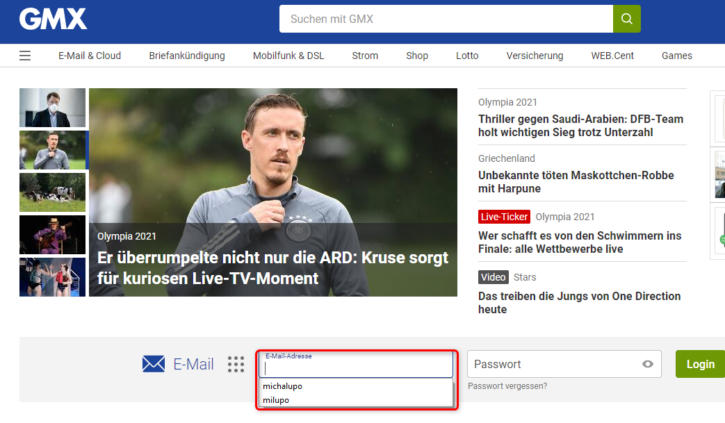 • Bei GMX werden die Daten bei mir auch nicht automatisch ausgefüllt, könnte aber auch wegen der mehreren Konten sein, die ich dort pflege und Firefox nichts Falsches ausfüllen will.
