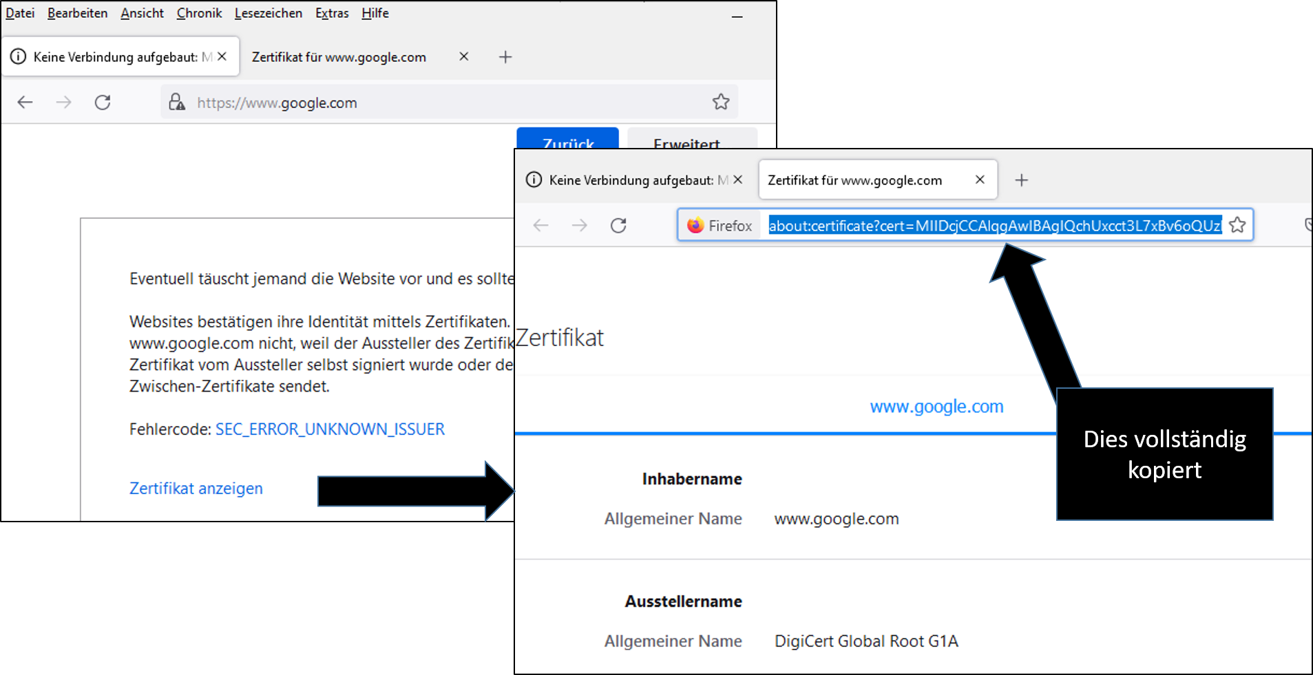 "Websites bestätigen ihre Identität mittels Zertifikaten. Firefox vertraut http://www.google.com nicht, weil der Aussteller des Zertifikats unbekannt ist [...]"
