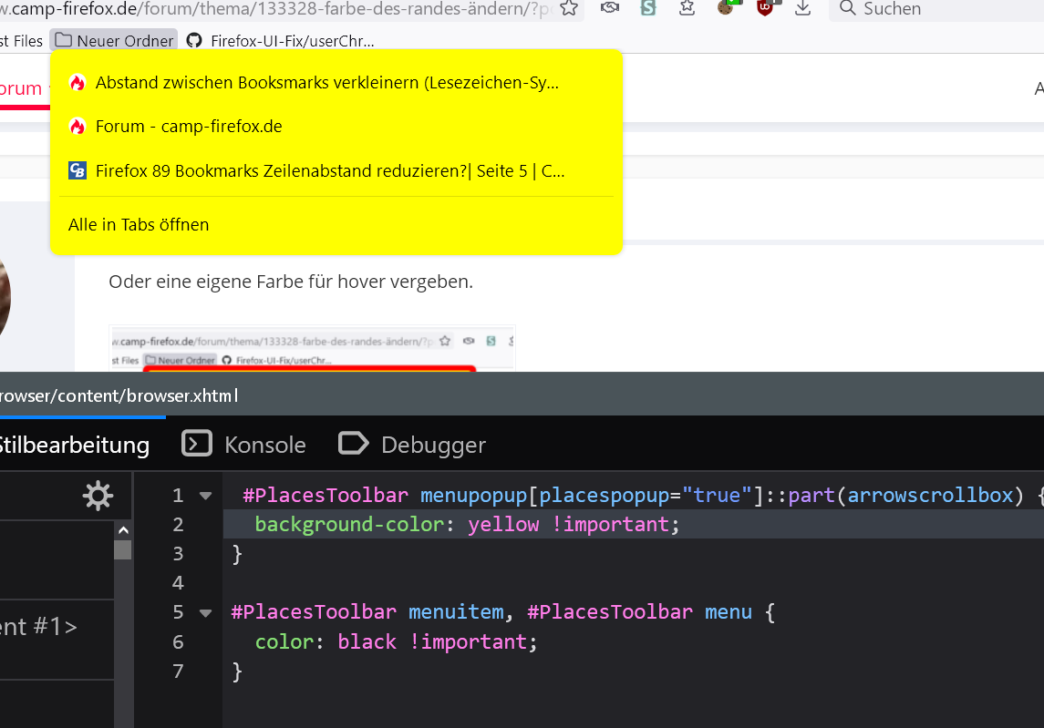 Nachdem mir gestern von euch besonders von Andreas geholfen wurde bei diesem Thema "Was muss wo geändert werden in FF 92.0" muss ich mich heute noch mal an euch wenden. Das Lesezeichenpopup ist wenn man es öffnet im Hintergrund weis. Ich hätte das gerne geändert z.B. in hellgrau. Ich habe selbst versucht an den Codes was zu ändern aber es nicht hinbekommen. Habe bei diesem Code den ich von Andreas bekommen habe.