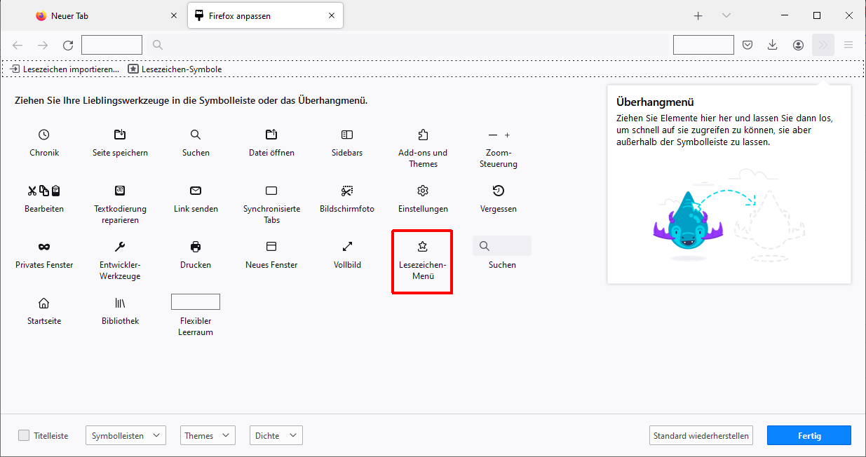 Habe es erst jetzt gemerkt: In der Symbolleiste fehlt neuerdings das icon zum Verwalten der Lesezeichen, das die Biblithek sofort öffnet. In dem Menü zur Anpassung der Symbolleiste finde ich auch nichts derartiges. Offensichtlich habe ich da was verpasst.