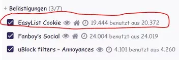 Meistens reicht das Auge im Popup. Aber genau das ist der Grund, mit ein Grund, warum ich die Erweiterung dazu nutze und nicht die Liste, weil das Auge alle kosmetischen Filter deaktiviert und nicht nur diesen einen, man bekommt also nicht nur den Cookie-Consent wieder zu sehen, sondern auch anderen sonstigen Mist und auch den, den man selbst unter "Eigene Filter" erstellt hat. Ausnahmen lassen sich auch mit der entsprechenden Erweiterung setzen, auch bei "Consent Blocker". uBlock ist für vieles gut, aber genau da patzt es. Ich klicke daher lieber auf den Cookie Consent, wenn nicht vermeidbar, aber dafür eine Seite blanko (weil uBlock deaktiviert ist für den Moment) walten lassen, kein Stück.