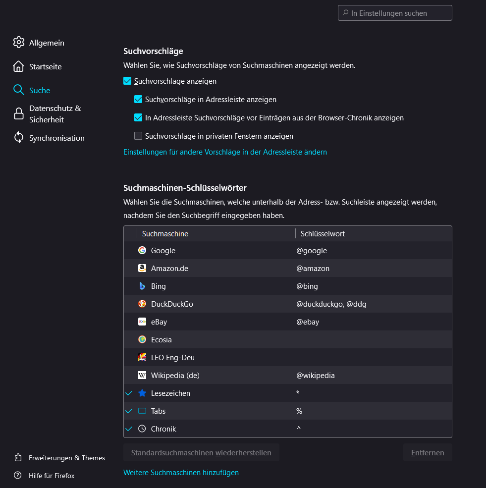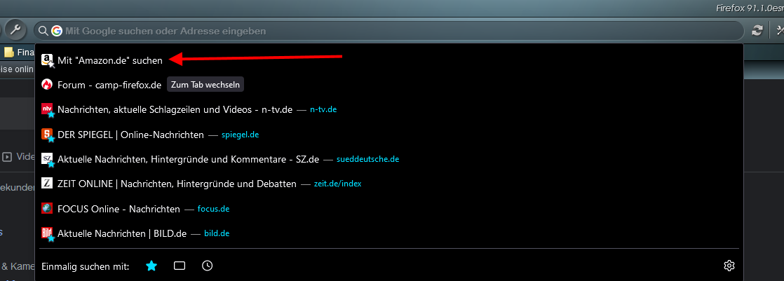 In der ESR-Version sind plötzlich(?) angepinnte Suchmaschinen in den Vorschlägen vorhanden: "amazon" und manchmal auch "google". In FF92 und der Nightly ist dies nicht der Fall, obwohl die Einstellungen eigentlich gleich sein sollten. Keine Ahnung, was ich da aus Versehen verstellt haben könnte.