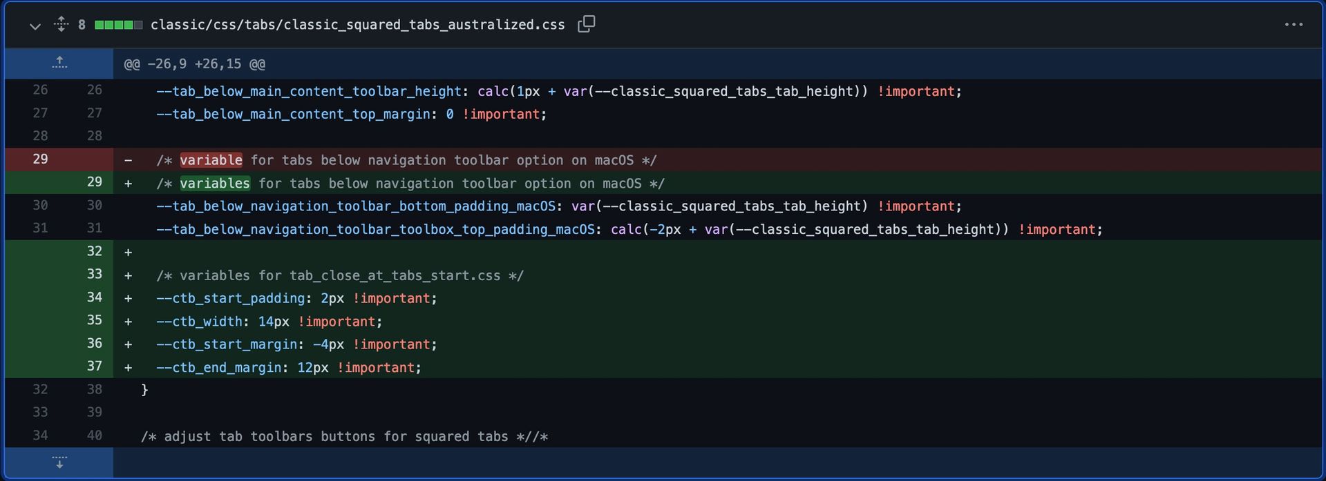 1. Ich nutze die aktuelle Version 4.1.0 der CustomCSSforFx von Aris und daraus unter anderem die Funktion "TABS BELOW NAVIGATION AND BOOKMARKS TOOLBARS / TABS NOT ON TOP". Diese Funktion wird durch folgenden css-Code bewirkt, der durch die userChrome.css aufgerufen wird (tabs_below_navigation_toolbar_macOS.css):