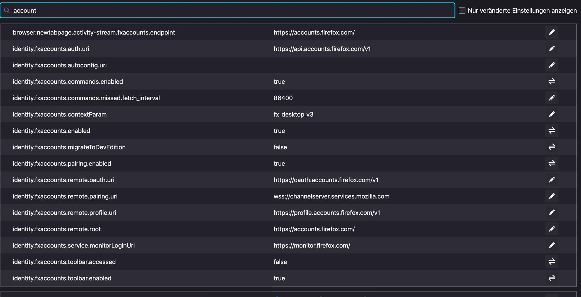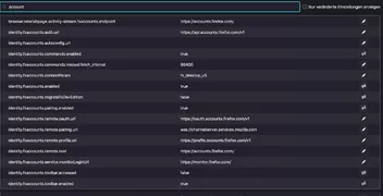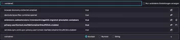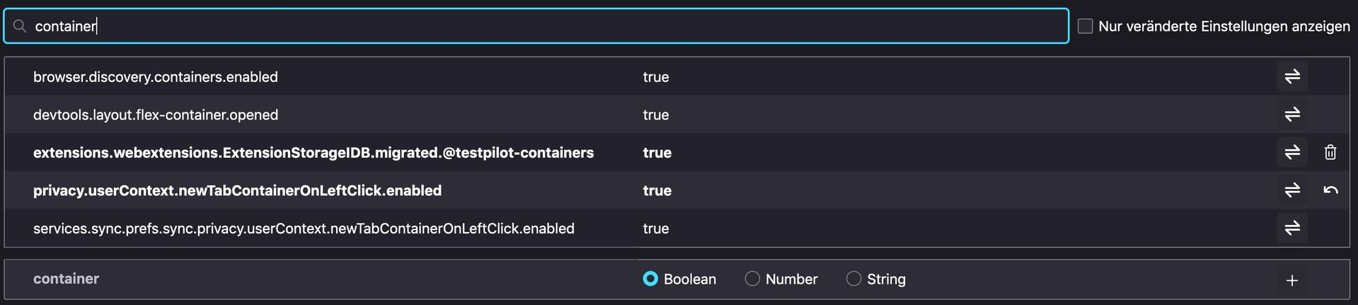 Abgesehen davon, wird bei der Suche z. B. nach "container" das hier in about:config angezeigt: