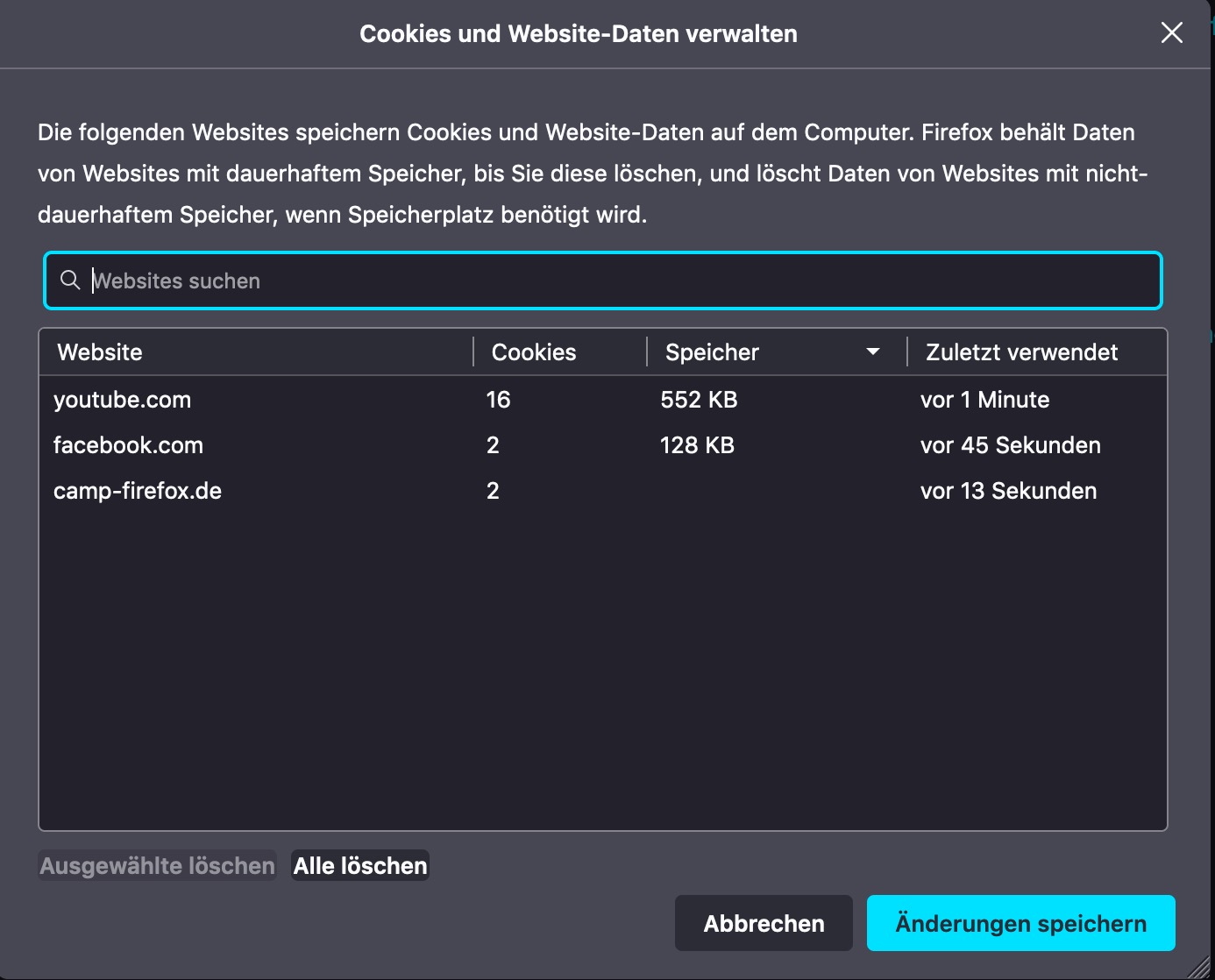 Kann ich nicht bestätigen. Diese drei Seiten hab ich jetzt testweise unter Verwendung der Add-ons MAC (Facebook und Youtube) und Temporary Containers (camp-firefox.de) in unterschiedlichen Containern geöffnet. Deren Cookies sind alle kumuliert in der "Cookies und Website-Daten"-Verwaltung zu sehen: