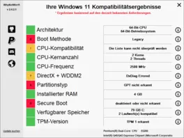 hat Jemand von Euch schon mal das neue Windows 11 ausprobiert? Ich wollte gerade mal testhalber ein 11er Windows in einer VirtualBox installieren, da fliegt mir auf meinem Arbeitsnotebook von 2017 das Setup um die Ohren, wegen nicht ausreichender "Kompatibilität". Da das windowseigene Tool die wirklich wichtigen Informationen typischerweise verschweigt, ließ ich mal ein Drittanbieter-Tool (WhyNotWin11.exe) drüberschauen und siehe da: