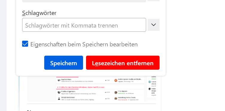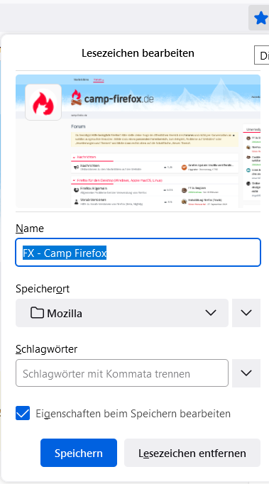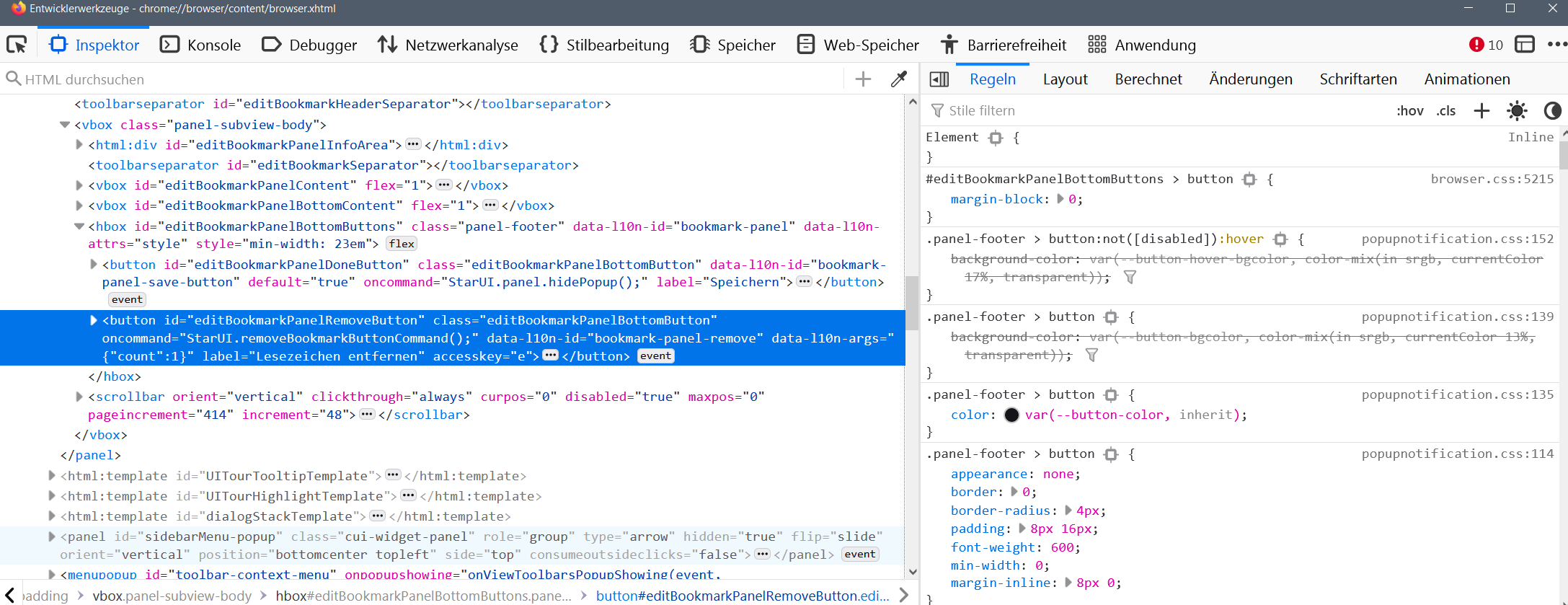 Es geht um den "Lesezeichen entfern" Button unten rechts im Quick Menü der Stern in aus der Adressleiste.