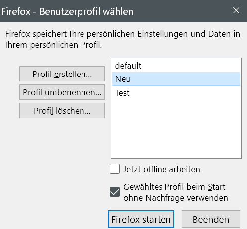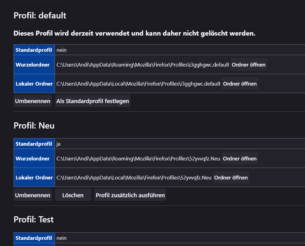 Ich habe drei FF-Profile "Banking" "Facebook" und "Standard". Alle drei kann ich ohne Probleme gleichzeitig öffnen. Wenn nun "Standard" offen ist und ich einen Link von Thunderbird oder Defender anklicke kommt nach ca. 3-4 Sek. diese Meldung.