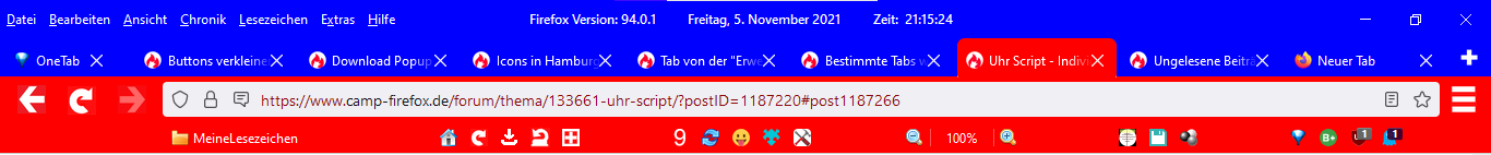 Alles anzeigenfunction doDatClockCallback() { try{ doDatClock(); } catch(ex){} } function doDatClock() { var options = { weekday: 'long', year: 'numeric', month: 'long', day: 'numeric', hour: '2-digit', minute: '2-digit', second: '2-digit' }; var locale = language || window.navigator.languages[0]; var timestr = new Date().toLocaleDateString( locale , options ); if( count == 1 ) { var counter = new Date( 1000 * sec ).toISOString().substr( 11 , 8 ); // .replace(/^[0:]+/, '') // if you want to replace zeroes and : timestr = timestr + ' (' + counter + ')'; sec++; } var ua = window.navigator.userAgent; var FFstr = ua.split(' '); var FF = FFstr[FFstr.length-1].replace( '/' , ' ' ); var text = "Firefox " + AppConstants.MOZ_APP_VERSION_DISPLAY; var agent = document.getElementById('statusbar-agent-display'); agent.setAttribute( 'value', text ); var status = document.getElementById('statusbar-clock-display'); status.setAttribute( 'value', timestr ); window.setTimeout( doDatClockCallback , 1000 ); } var sec = 0; var count = 0; // if you don't want a counter set this to zero var language = 'de-DE'; // locale, e.g. 'de-DE' , 'en-US' , 'fr-FR' var css = 'padding-top: 9px !important; padding-left: 5px !important; color: black; font-weight: 700; text-shadow: none;'; var ClockStatus = document.getElementById("tabbrowser-tabs"); var AgentLabel = document.createXULElement('label'); AgentLabel.setAttribute('id', 'statusbar-agent-display'); AgentLabel.setAttribute('class', 'statusbarpanel-text'); AgentLabel.setAttribute('style', css); var ClockLabel = document.createXULElement('label'); ClockLabel.setAttribute('id', 'statusbar-clock-display'); ClockLabel.setAttribute('class', 'statusbarpanel-text'); ClockLabel.setAttribute('style', css); ClockStatus.parentNode.insertBefore(ClockLabel, ClockStatus.nextSibling); ClockStatus.parentNode.insertBefore(AgentLabel, ClockStatus.nextSibling); doDatClock();Eigener Text wird nicht benutzt.