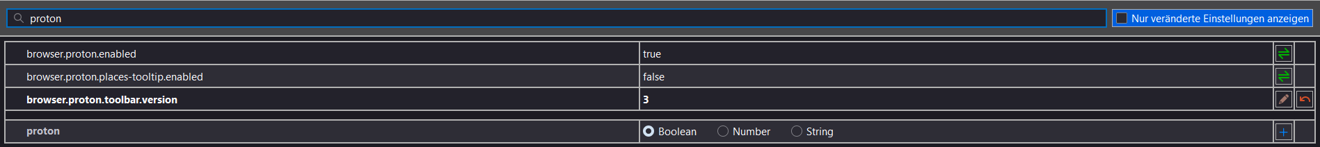 • Die meisten Schalter, die in Zusammenhang mit Proton eingeführt worden sind, existieren nicht mehr. Das ist aus deinem Screenshot eigentlich eh nur noch browser.proton.enabled und selbst der macht nur noch einen Bruchteil dessen, was er mal gemacht hat. Der Schalter browser.proton.places-tooltip.enabled ist nach wie vor deaktiviert, weil das eine Änderung ist, die nicht fertig wurde, und entweder wird das noch irgendwann fertiggestellt oder man entfernt die Implementierung wieder, dann kann auch der Schalter verschwinden. Und browser.proton.toolbar.version ist wie gesagt ein interner Zähler. Da dieser für Profil-Migrationen verantwortlich ist, wird der vermutlich noch die nächsten Jahre in Firefox bleiben.